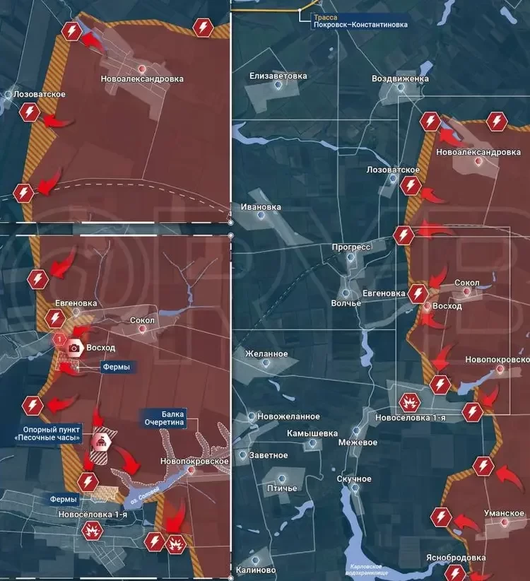 Южнее российские подразделения закрепляются на северных окраинах Новосёловки Первой, которые были заняты после успешного штурма опорного пункта «Песочные часы». Наступление идет и с востока, где ВС РФ прошли на несколько сотен метров вперед и закрепились на подступах к селу. Штурм самого населённого пункта пока ещё не начался, но, предположительно, он уже не за горами.