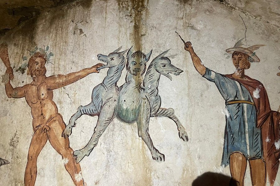 В прошлом году археологи обнаружили удивительное захоронение в Гробнице Цербера, расположенной в Джульяно, неподалёку от Неаполя. А недавно исследователи получили возможность заглянуть внутрь запечатанного саркофага, находящегося внутри этой ярко расписанной фресками камерной гробницы, сообщает The History Blog.