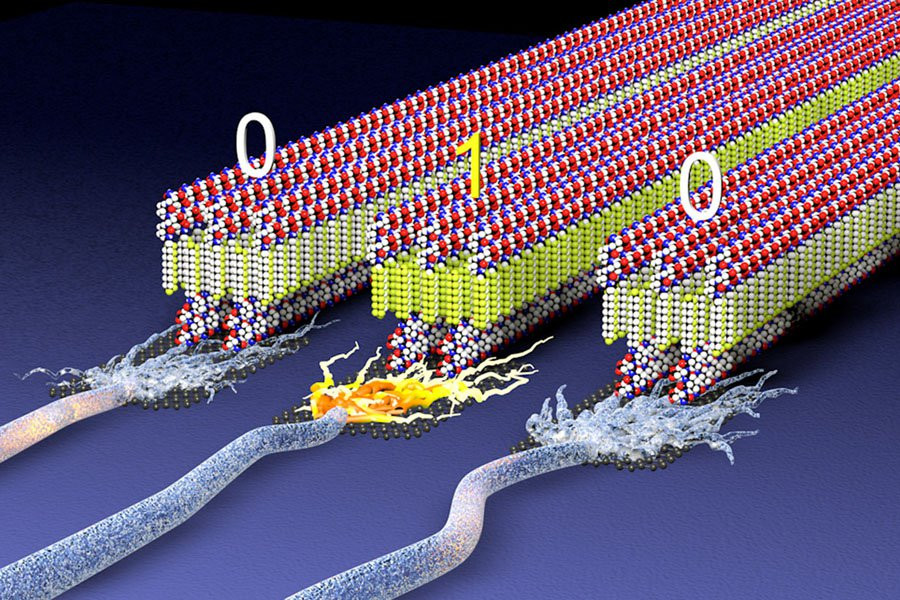 Новый материал Стаппа может хранить энергию или информацию, электрически переключая полярность каждой ленты. И поскольку пептид на конце каждой ленты может быть связан с белками на нейронах или других клетках, молекулы могут регистрировать сигналы от мозга, сердца или других органов — или электрически стимулировать их. Используя маломощные методы, такие как ультразвук, чтобы «зарядить» молекулы, материал может быть использован для стимуляции нейронов в качестве лечения хронического паралича, говорит Стапп.