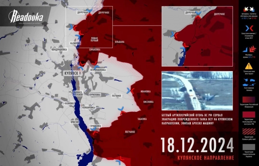 На Купянско-Сватовском направлении российские войска форсировали Оскол и закрепились на юге населенного пункта Двуречное. В районе идут бои с целью расширения плацдарма и формирования устойчивого фронта на правом берегу реки.