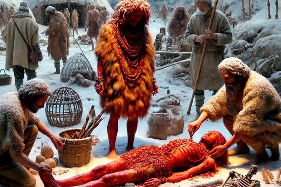 Красная охра, распространённая в ритуалах эпохи палеолита, также применялась для натирания статуэток и посыпания тел умерших. Учёные предполагают, что древние мастера заметили свойства охры в сочетании с золой и остатками костей, пережжённых в очаге. Такое взаимодействие позволяло создавать устойчивые красочные составы, которые эффективно окрашивали шкуры и ткани.