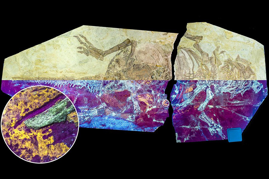 «Окаменелость действительно является скрытой жемчужиной», — сказал палеонтолог Университетского колледжа Корка доктор Цзысяо Ян. «Ископаемая кожа не видна невооруженным глазом, и она оставалась скрытой, когда образец был передан в дар Нанкинскому университету в 2021 году. Только под ультрафиолетовым светом кожа видна в ярком оранжево-желтом свечении».