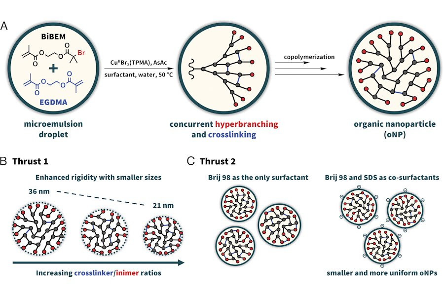 Новый подход, использующий микроэмульсии на основе инимеров, решил эти проблемы. Он позволяет создавать органические наночастицы с высокой однородностью и настраиваемыми механическими свойствами, а также функциональностью. Это достигается путем изменения плотности поперечных связей и добавления функциональных малых молекул.