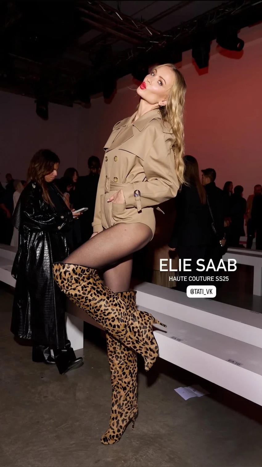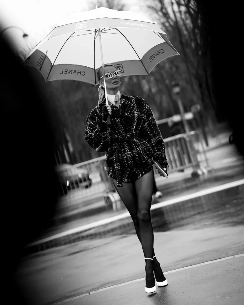 На показе Chanel Татьяна появилась в твидовом костюме модного дома с трусами-шортами. Акцентом в образе стали очки в форме логотипа бренда и фирменный зонт. На шоу Elie Saab Корсакова пришла в бежевом тренче-боди, леопардовых ботфортах и с сумкой в виде сердца, а на Jean Paul Gaultier надела кожаные трусы и микрожакет коричневого оттенка.