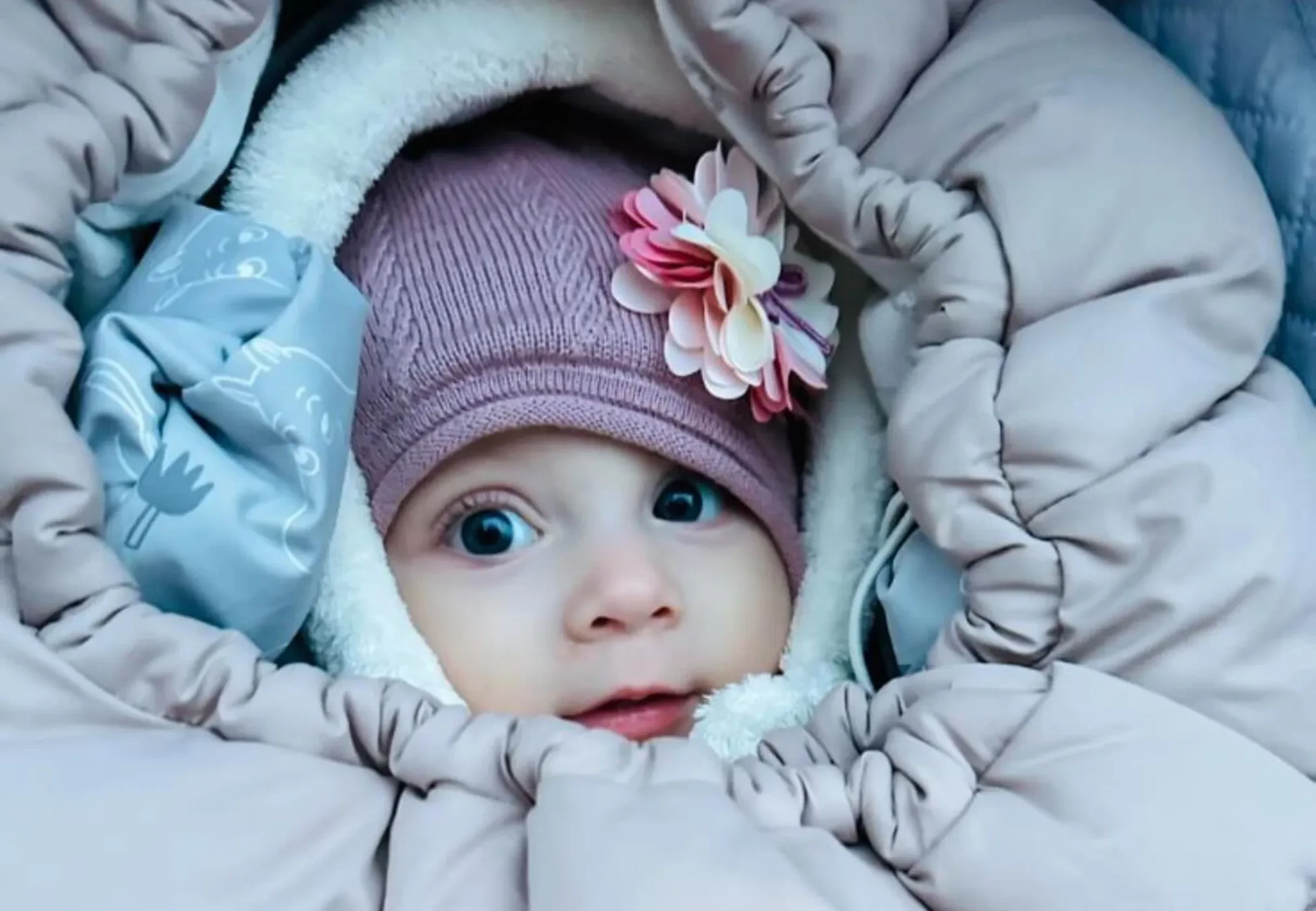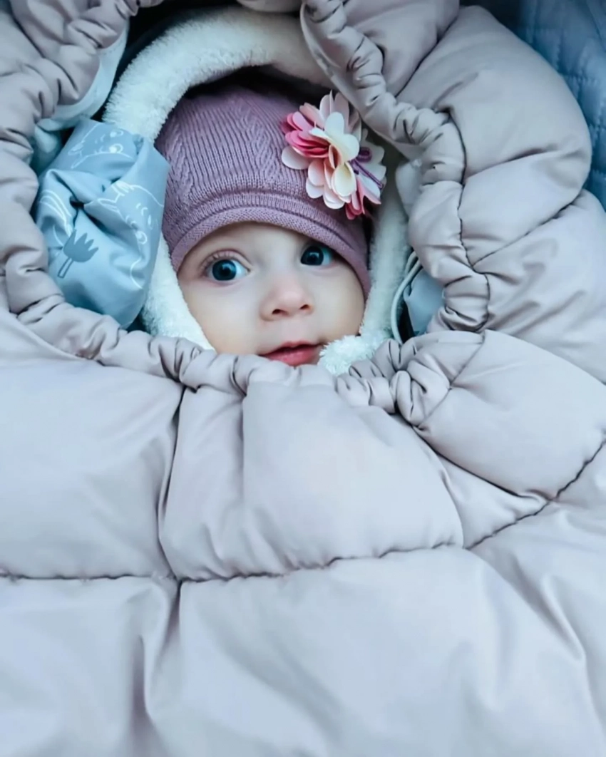 На фотографии маленькая Лия лежит в коляске, одетая в тёплый костюм и шапку. Это первое фото, на котором девочка запечатлена так близко и чётко.