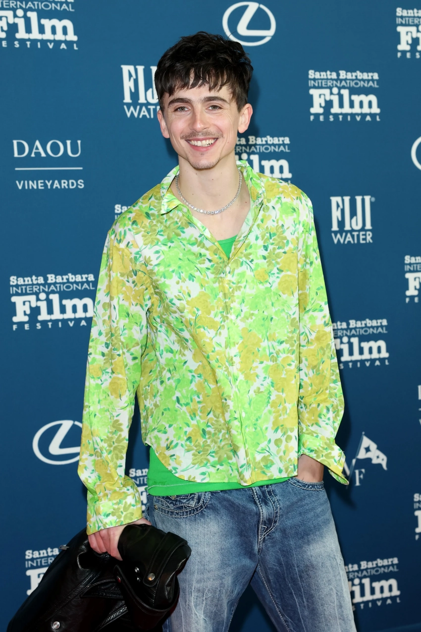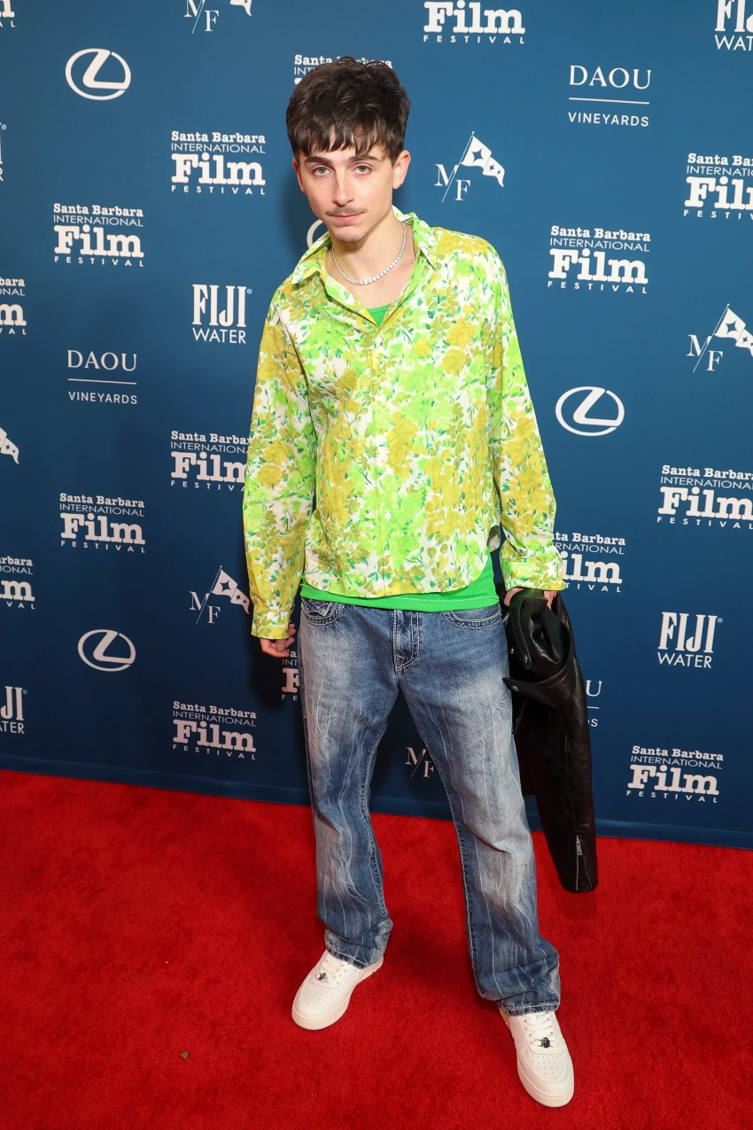 29-летний Шаламе выбрал для мероприятия лаймово-зелёную рубашку с цветочным узором, под неё он надел ярко-зелёную майку и дополнил образ цепочкой серебряного цвета. Также актёр продемонстрировал свою новую стрижку-пикси. Его девушка, 27-летняя Кайли Дженнер пришла поддержать его во время вручения премии "Артист года", однако по традиции на дорожке не появилась. Она присоединилась к актёру уже в зрительном зале.
