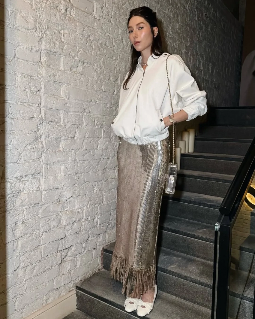 Юлия Калманович вышла в свет в трендовой серебристой юбке собственного бренда, Анастасия Миронова облачилась в кожу, Ольга Серябкина — в прозрачный наряд, а Лянка Грыу примерила бежевое платье.
