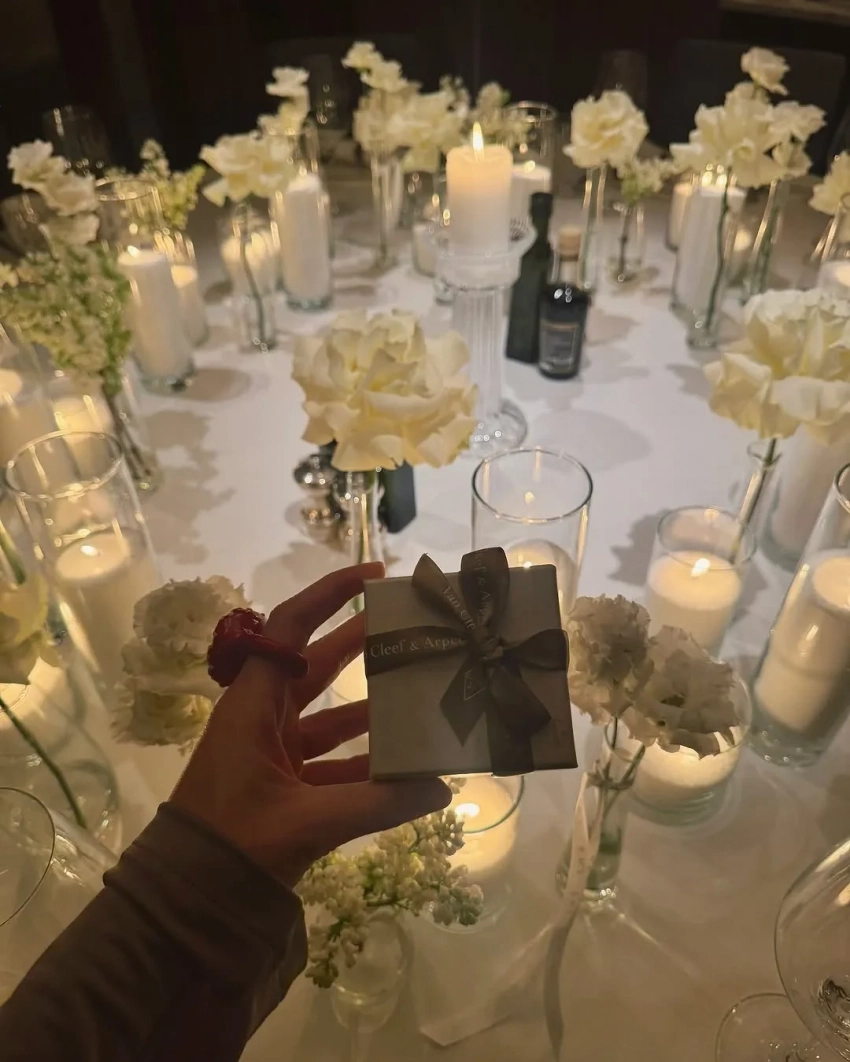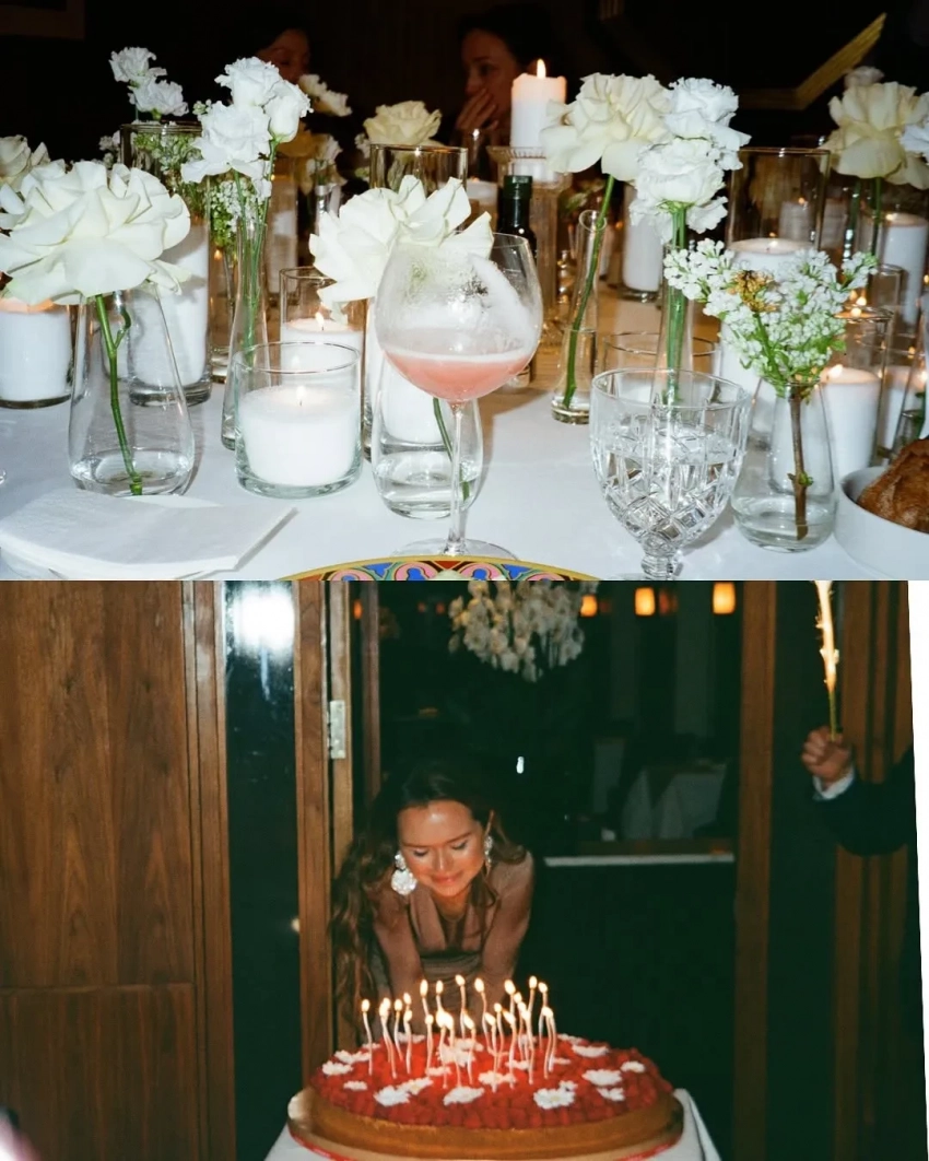 Именинница собрала гостей за круглым столом, украшенным цветами и свечами, и нарядилась в серебристый облегающий костюм собственного бренда Dress by Stesha. Образ блогер дополнила массивными серьгами и кольцом Lili Archive.