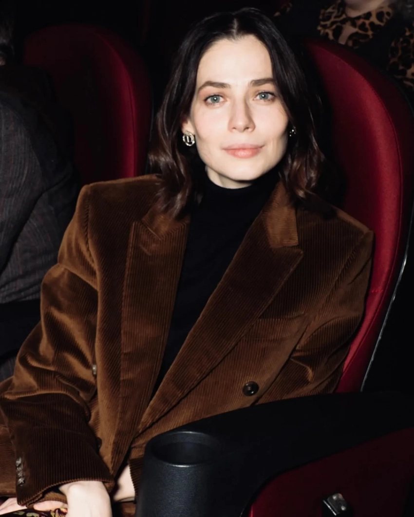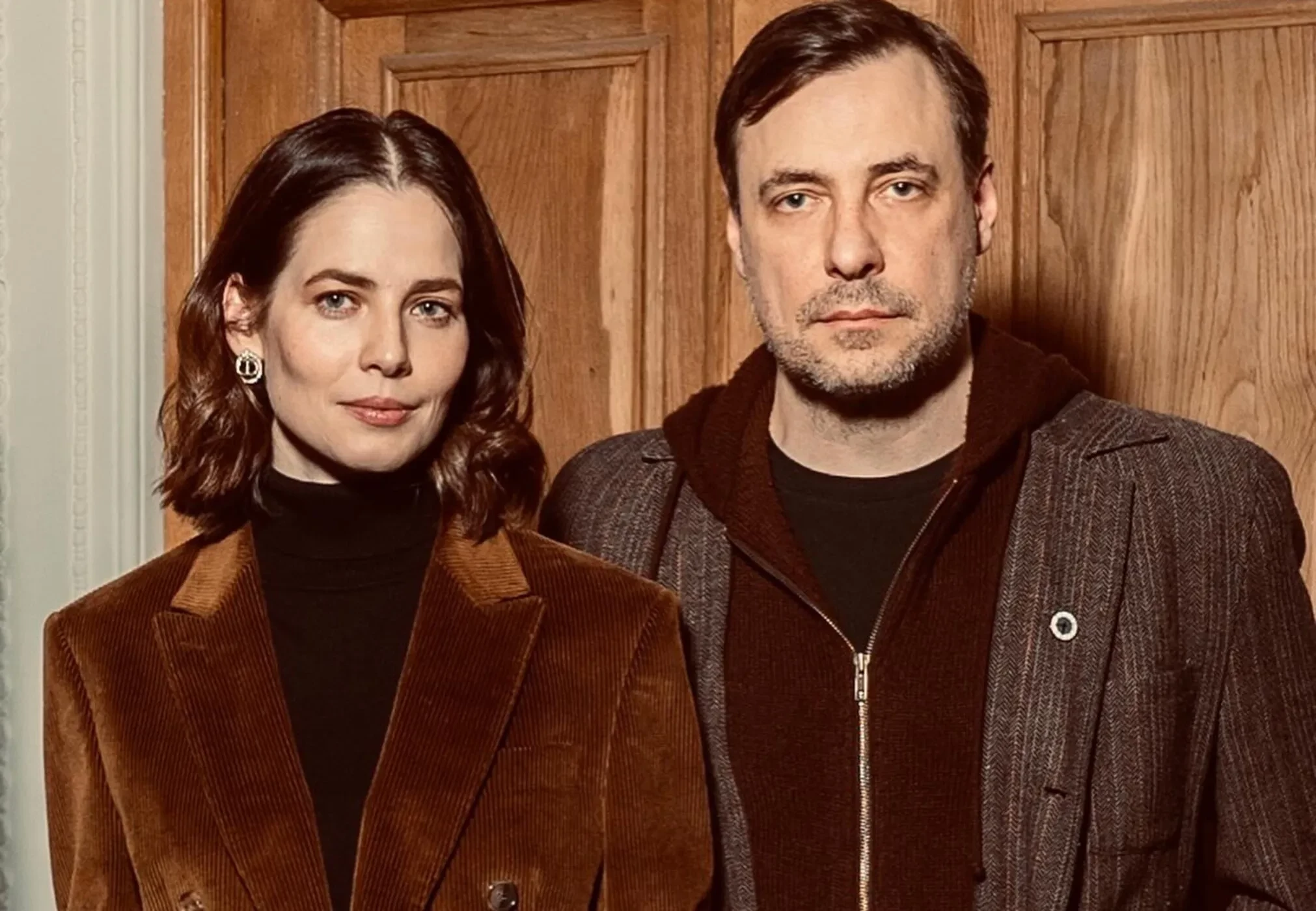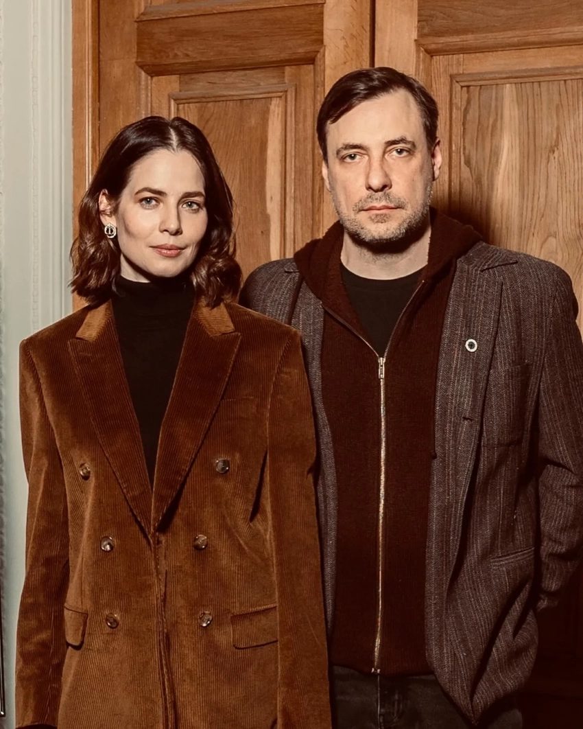 41-летняя Снигирь для выхода в свет выбрала тёмную водолазку и коричневый пиджак, а 45-летний Цыганов — бордовый джемпер и серый пиджак.