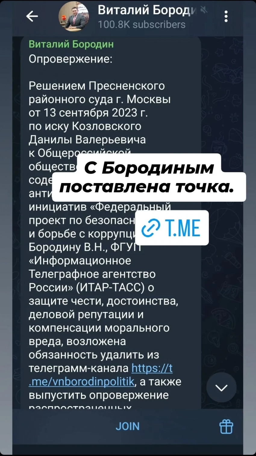 Весной 2023 года Бородин обвинил Данилу Козловского в призывах к митингам, ссылаясь на его интервью Ирине Шихман**. Однако позже выяснилось, что он процитировал слова, которые актёр говорил на съёмках сериала о революции. Козловский подал в суд на Бородина и осенью выиграл дело. Бородин попытался обжаловать решение, но суд снова поддержал Козловского.