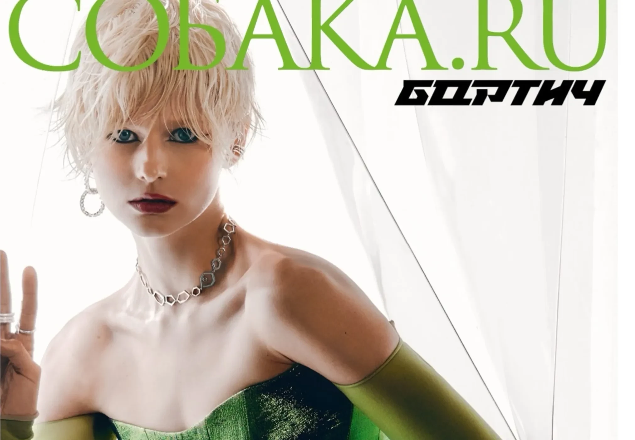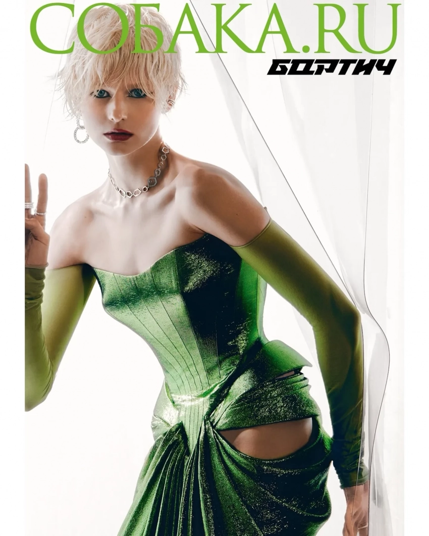 На снимке Бортич предстаёт в футуристичном образе. Она позирует в зелёном блестящем корсетном платье с драпировками и вырезом на бедре, дополненном длинными перчатками в тон, а завершает образ новая стрижка — пикси с текстурными прядями.
