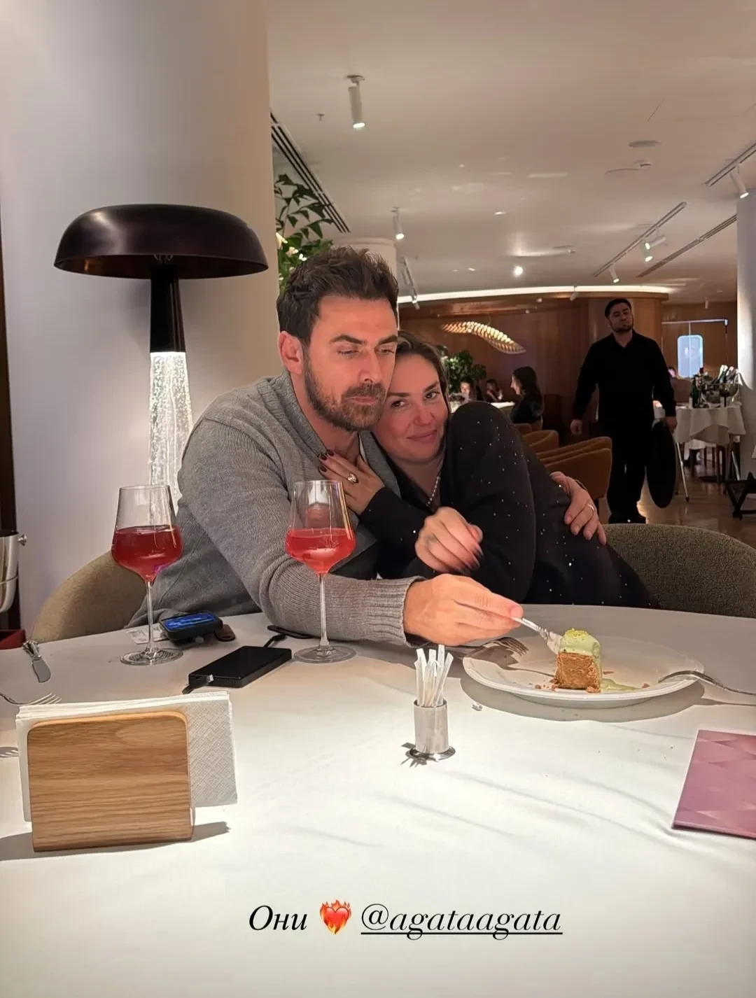 За ужином в ресторане, где проходило скромное торжество, также собрались близкие подруги Агаты: они активно фотографировали её и снимали на видео. Кадрами, на которых Муцениеце запечатлена обнимающейся с дочерью и с возлюбленным, актриса позже сама поделилась в своих соцсетях.
