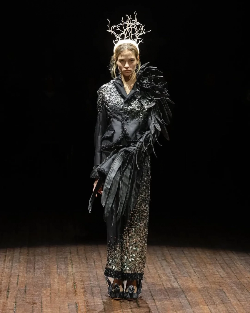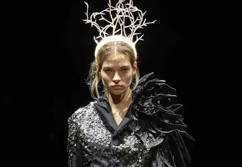 В Париже в рамках Недели моды состоялся показ осенней коллекции бренда Undercover. Шоу открыла и закрыла Алеся Кафельникова. 26-летняя российская модель прошлась по подиуму в белом костюме, расшитом золотом, а в финале вышла в чёрном комплекте с перьями.