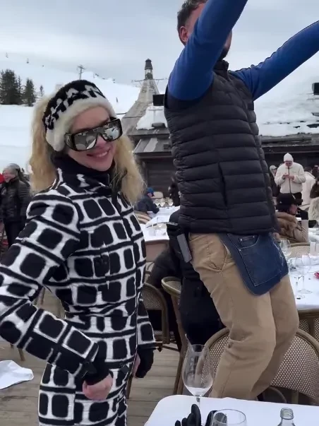 Экс-солистку группы "Мобильные блондинки" и популярную светскую львицу нулевых, 45-летнюю Ольгу Курбатову можно назвать амбассадором Куршевеля: она признаётся в любви к курорту и часто там отдыхает. В этот приезд Ольга, как и всегда, наслаждается дневными тусовками в шубе и меховой шапке, комбинезоне Philipp Plein, мунбутах Dior, повязке Chanel и под хиты "Руки Вверх!", а ближе к ночи она переодевается в золотое платье и направляется на другую вечеринку, где танцует под Юрия Шатунова. Ольга написала в инстаграме*, что в этот приезд она даже ни разу не встала на лыжи: "Пока я пеший экспонат, зато какой блестящий".