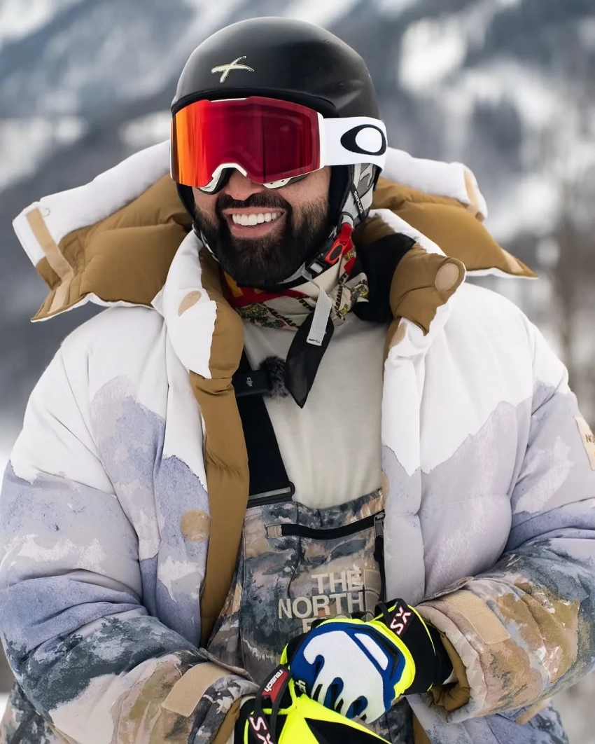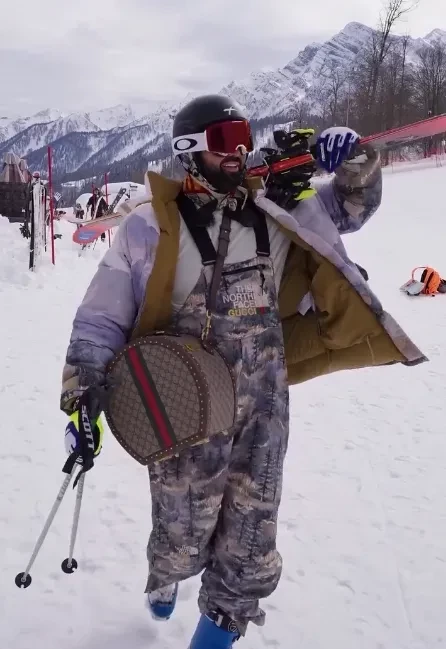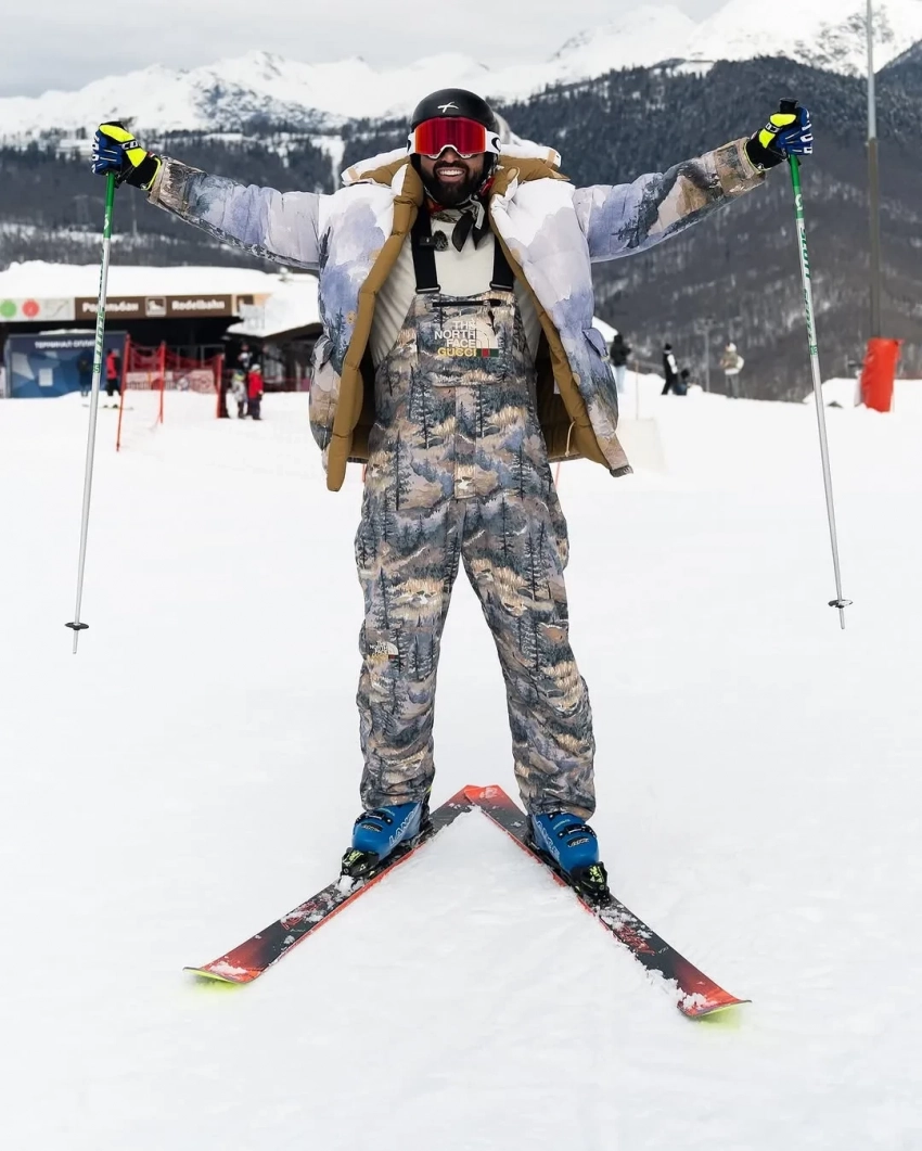 Самый улыбчивый блогер России Николай Василенко тоже не отстаёт от тренда apres ski. Он отправился на "Розу Хутор", где прокатился на лыжах "при полном параде", надев комбинезон The North Face с сумкой Gucci Savoy и не забыл про свой "фирменный" платок на шее.