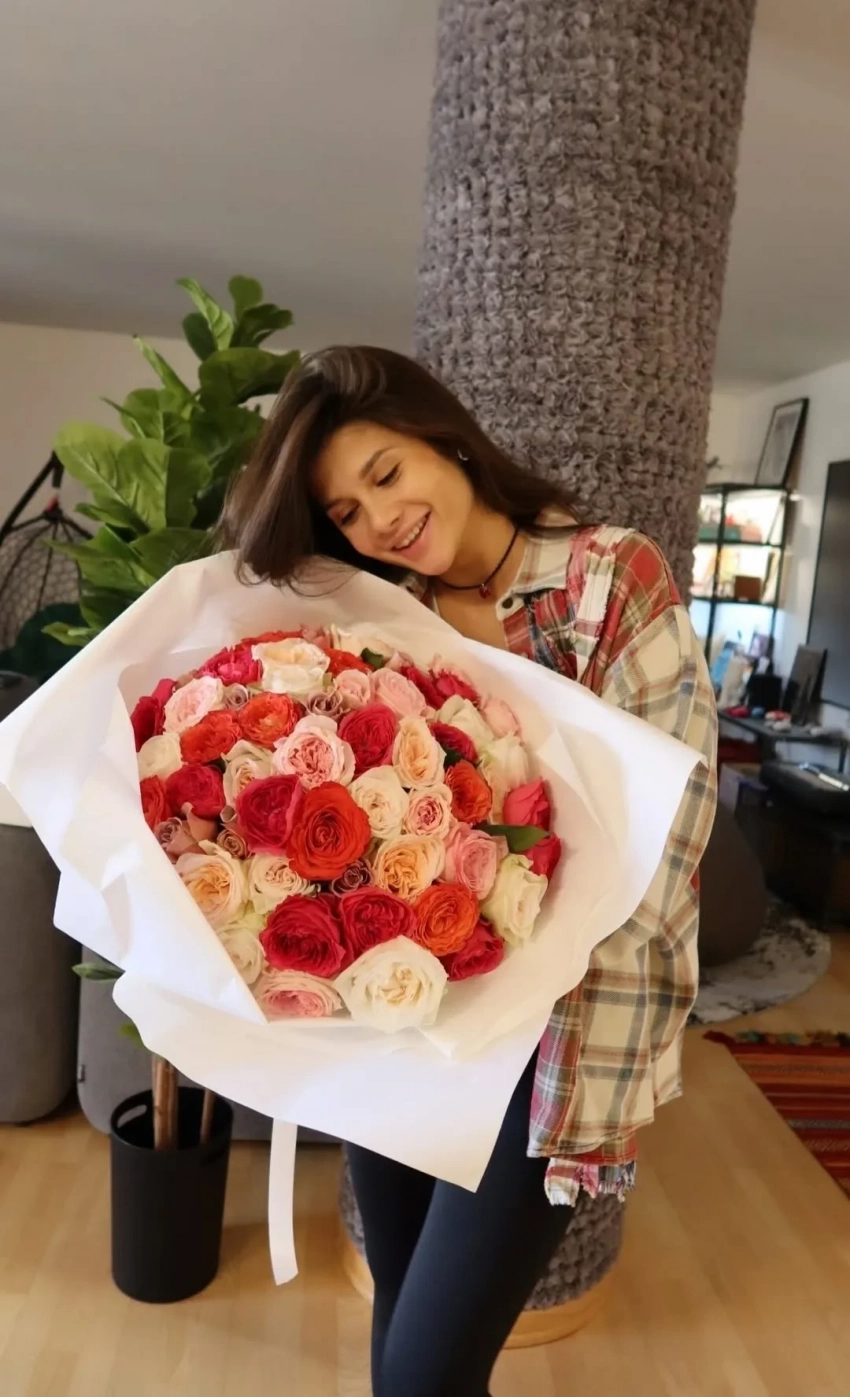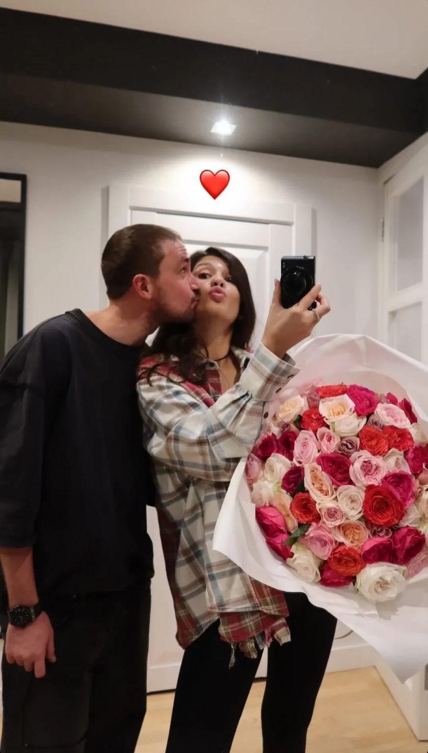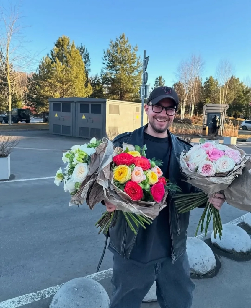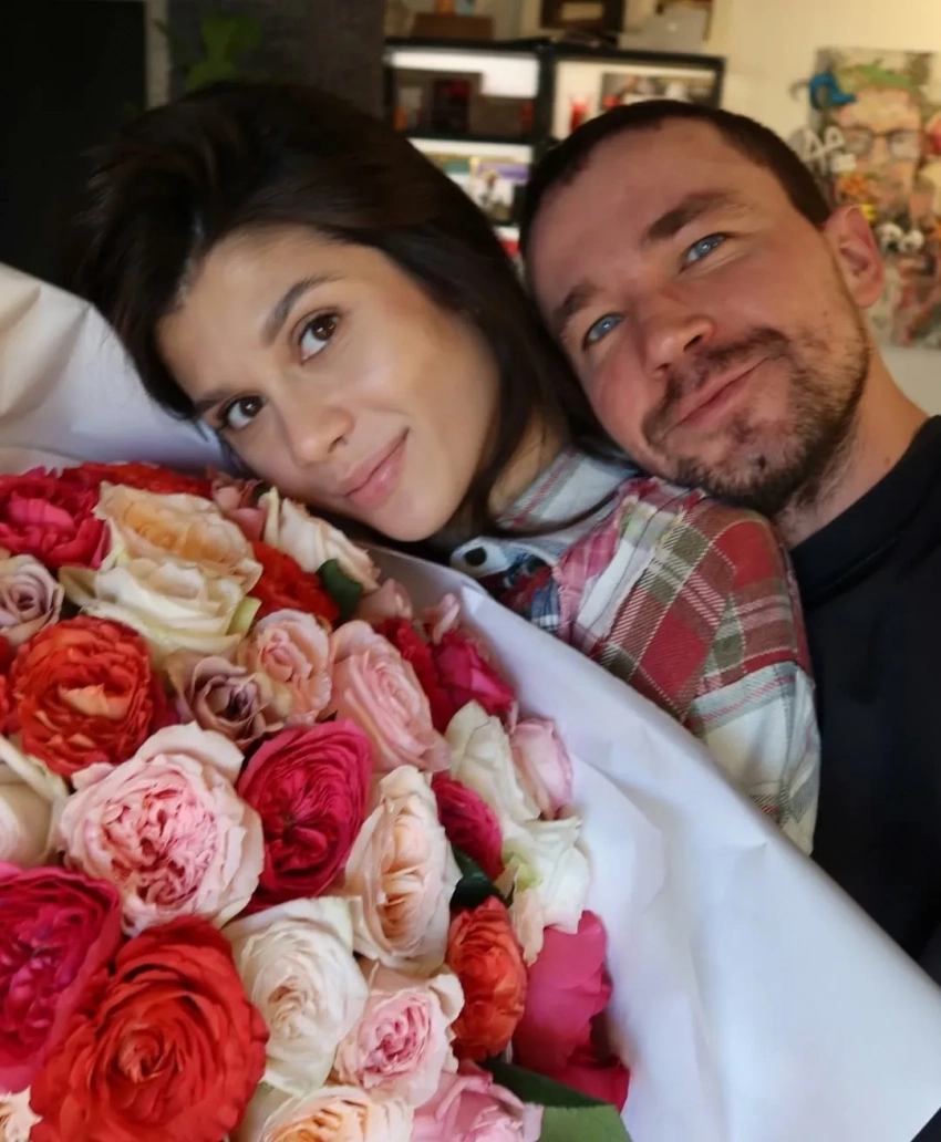 Актер подарил супруге большой букет из красных, розовых и белых роз. Пара сфотографировалась вместе и опубликовала снимки в соцсетях.