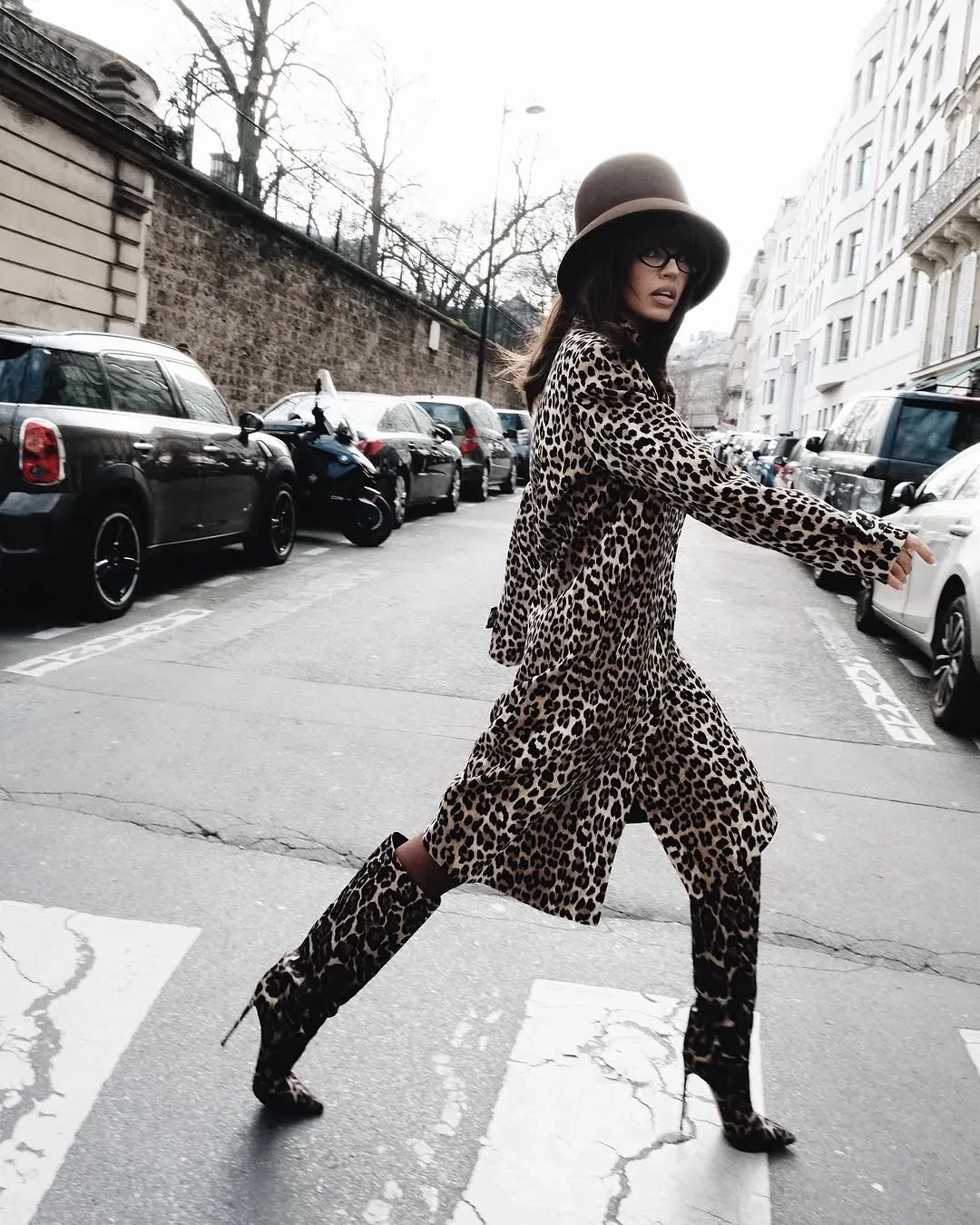 На следующий день 34-летняя певица отправилась на показ Nina Ricci — уже в образе в стиле ретро. Она позировала на стритстайле в леопардовом пальто и сапогах, дополнив образ объёмной шляпой и очками с прозрачными линзами.