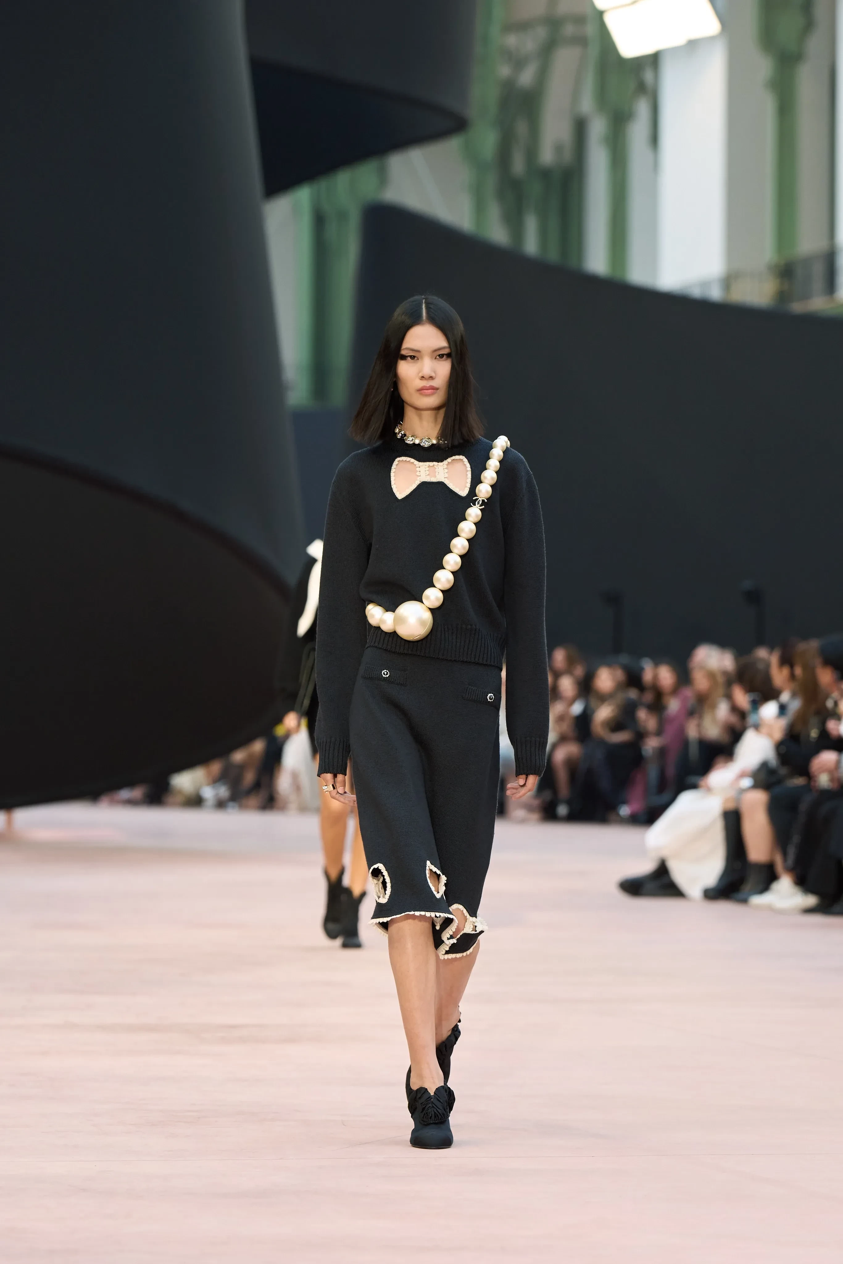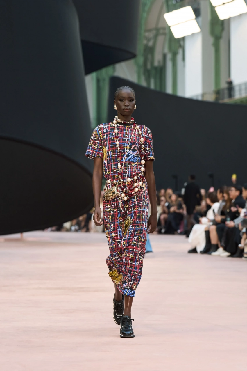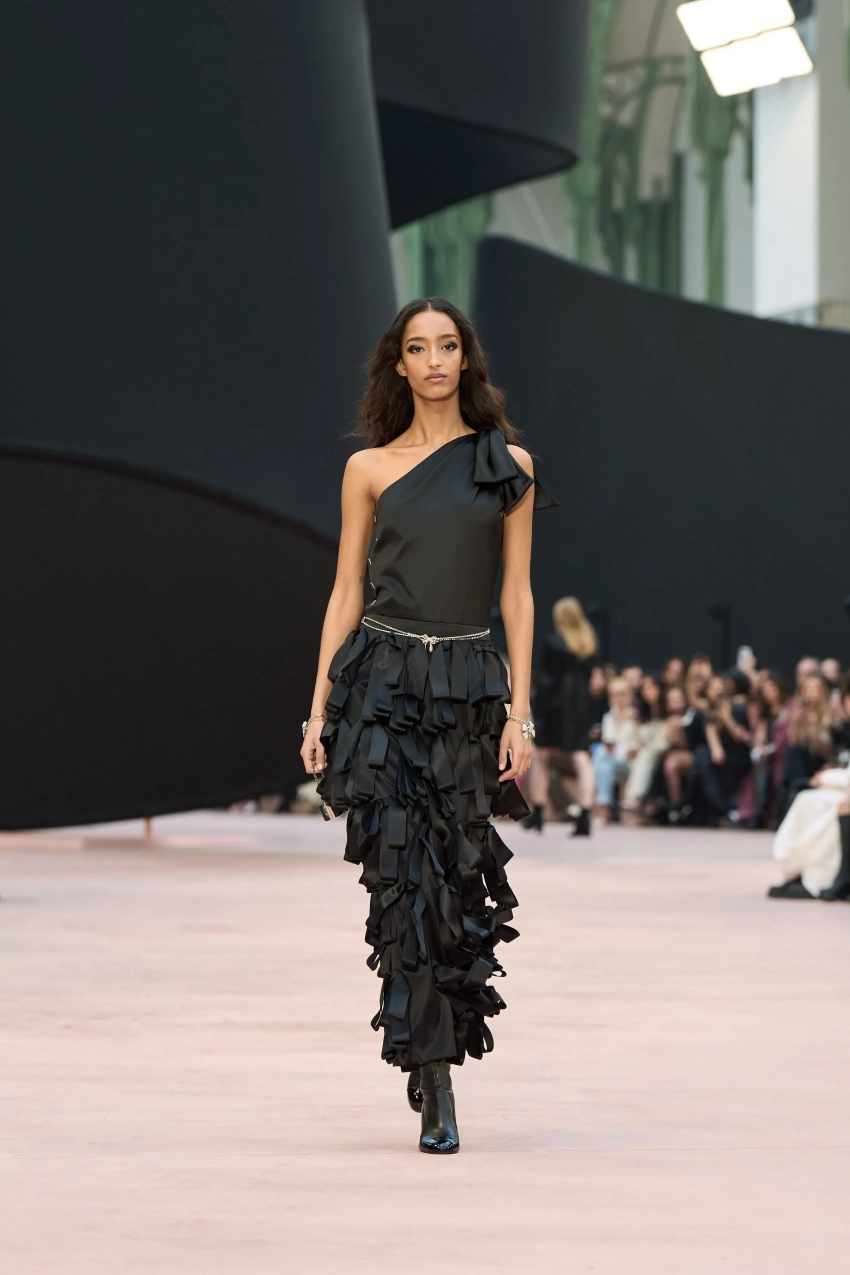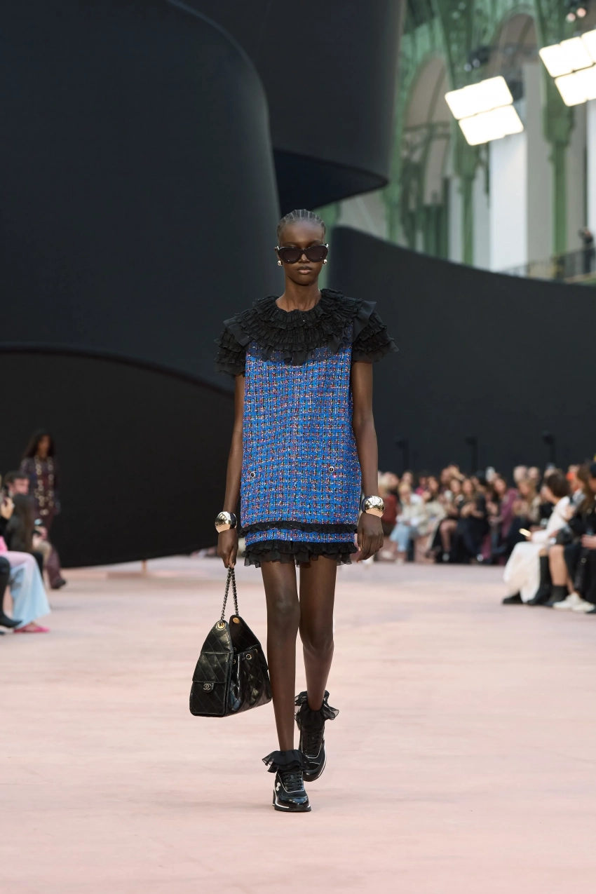 https://t.me/spletnikru2024/26433В новой коллекции дизайнеры представили твидовые платья с прозрачной юбкой, костюмы из вельвета, вязаные свитера-платья, а многие изделия украшали банты, которые сейчас в тренде. Также внимание привлекли массивные жемчужные бусы и шляпы.