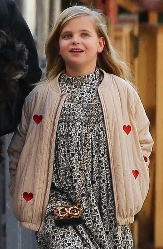 Для выхода модель выбрала кэжуал-образ: широкие тёмные брюки, свитер с леопардовым принтом, чёрный бомбер оверсайз и солнцезащитные очки. В руках она держала свою собаку породы мальтипу по кличке Арахис. Семилетняя Лея была одета в цветочное платье, пыльно-розовый бомбер с сердечками, зелёные колготки и коричневые сапоги. Образ девочки дополняла маленькая сумочка, перекликающаяся с цветовой гаммой свитера матери.