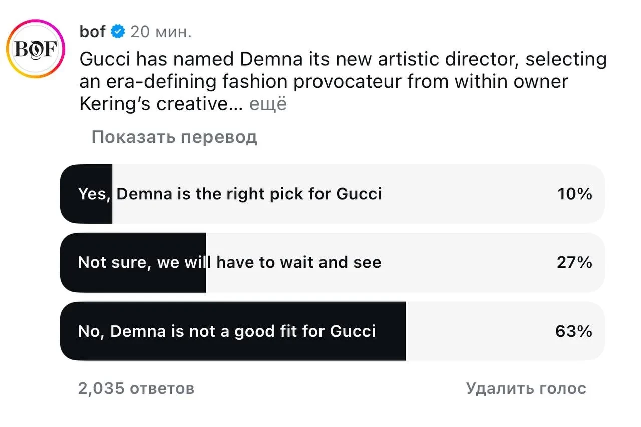 Помимо этого, один из крупнейших онлайн-ресурсов о моде The Business of Fashion провёл среди читателей опрос о том, подходит ли Демна Гвасалия на роль главы Gucci. Большинство высказалось против, однако позже опрос был удалён с платформы без объяснения причин.