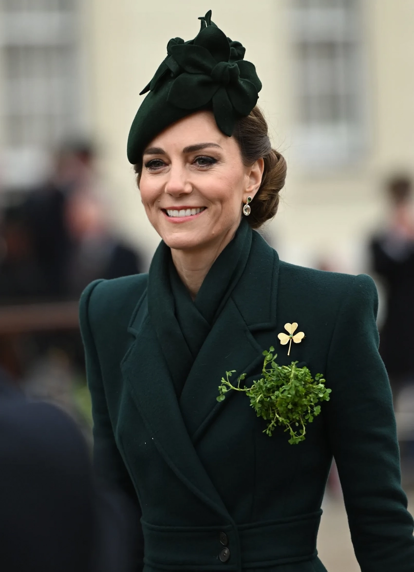 Перед военнослужащими Ирландской гвардии в графстве Гемпшир на юге Англии 43-летняя Кейт появилась в зелёном пальто Alexander McQueen, дополнив образ чёрными сапогами на каблуке и шляпкой с цветком. Пальто герцогини украшала золотая брошь в виде трилистника. Супруг Кейт Миддлтон, 42-летний принц Уильям, не сопровождал жену во время этого визита.