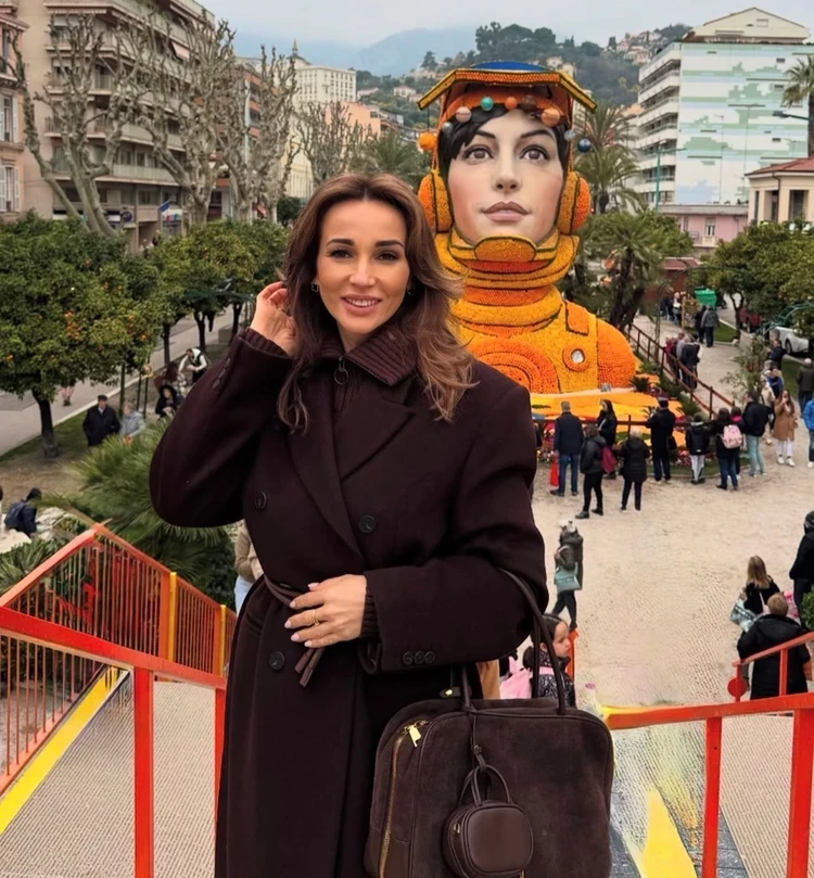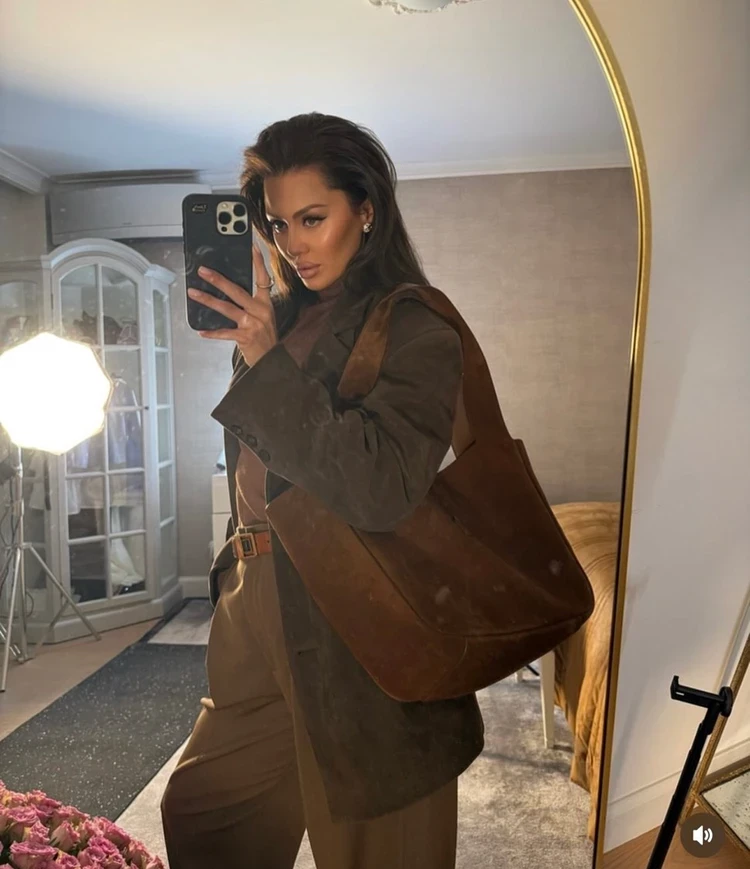 Анфиса демонстрирует монохромный лук в ультрамодном коричневом цвете, который заменил набивший всем оскомину винный оттенок. Шоколадное пальто ведущая сочетает с коричневым свитером на молнии и дополняет замшевой сумкой такого же цвета. Логотипа не видно, но по форме и закругленным краям можно догадаться, что перед нами самая желанная сумка всех модниц — от бренда Миуччи Прады Miu Miu (€3100 на официальном сайте). А на ее ручке висит ее микропия. Что ж, Чехова точно следит за трендами.