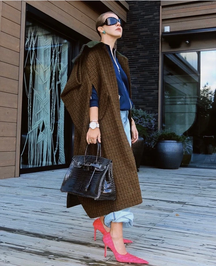 В руках Ксении легендарная крокодиловая Hermes Birkin, которая в настоящее время стоит более 10 млн рублей. В принципе за эту сумму вполне можно купить однокомнатную квартиру в Москве. При этом, аксессуар, названный в честь актрисы и певицы Джейн Биркин, не так просто заполучить. Нужно встать в очередь. Порой модницам приходится ждать несколько лет. «Тяжелый люкс» Собчак сочетает с толстовкой на молнии, джинсами и клетчатым кейпом. Завершающий штрих — ярко-розовые туфли, которые в сети прозвали лыжами. Добавлю, что такая сумка, как у Собчак каждый год лишь растет в цене, превращаясь в очень дорогой винтаж.