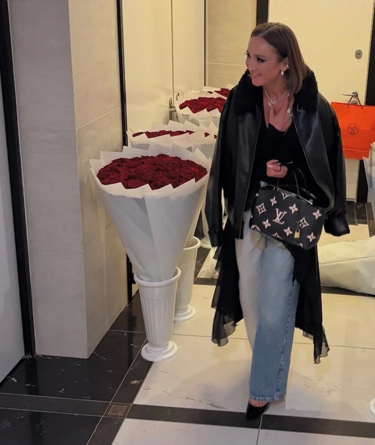 Дочь Дмитрия Маликова собрала очень нежный образ в розовых оттенках. Пушистый костюм от своего бренда Dress by Stesha Стефания сочетала с кокетливыми пушистыми мюлями. И завершила лук с помощью сумки популярной модели Kelly от Hermes. Цену трудно назвать, так как коллекция вышла не вчера, но точно больше 2 млн рублей. Мне понравился обвес на аксессуаре в виде милой ромашки. Плюс шелковый платок. Все очень красиво.