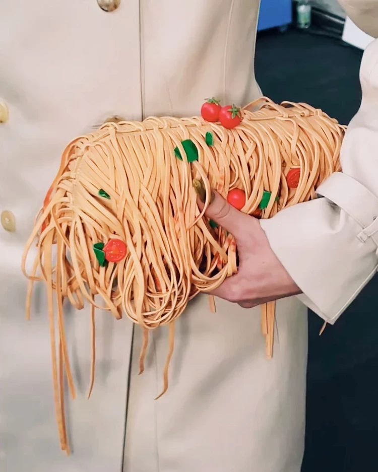 Moschino известен своей любовью к необычным формам. Так, на сайте итальянского бренда можно найти сумки в виде куска пиццы или дольки арбуз. А на недавнем показе дом моды анонсировал клатч из коллекции осень-2025 — он выполнен в виде… спагетти. Всем любительницам макарон посвящается.