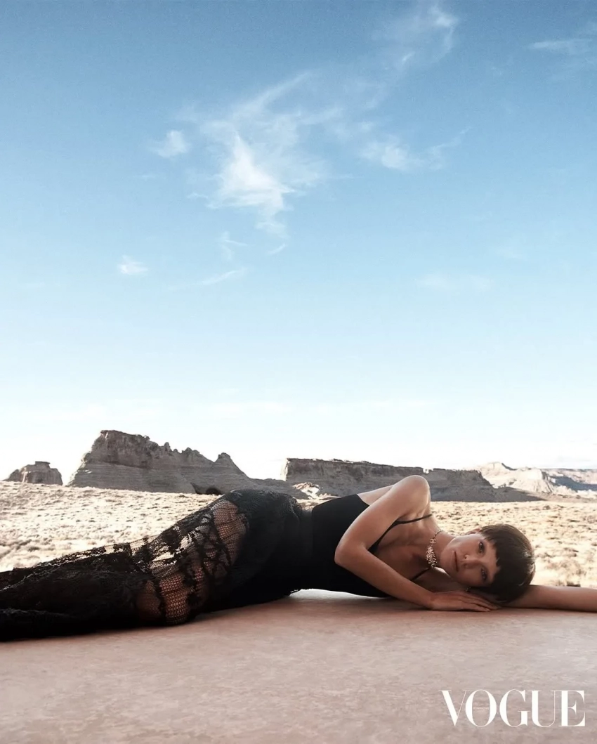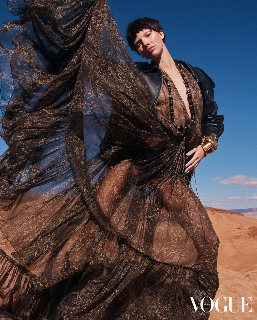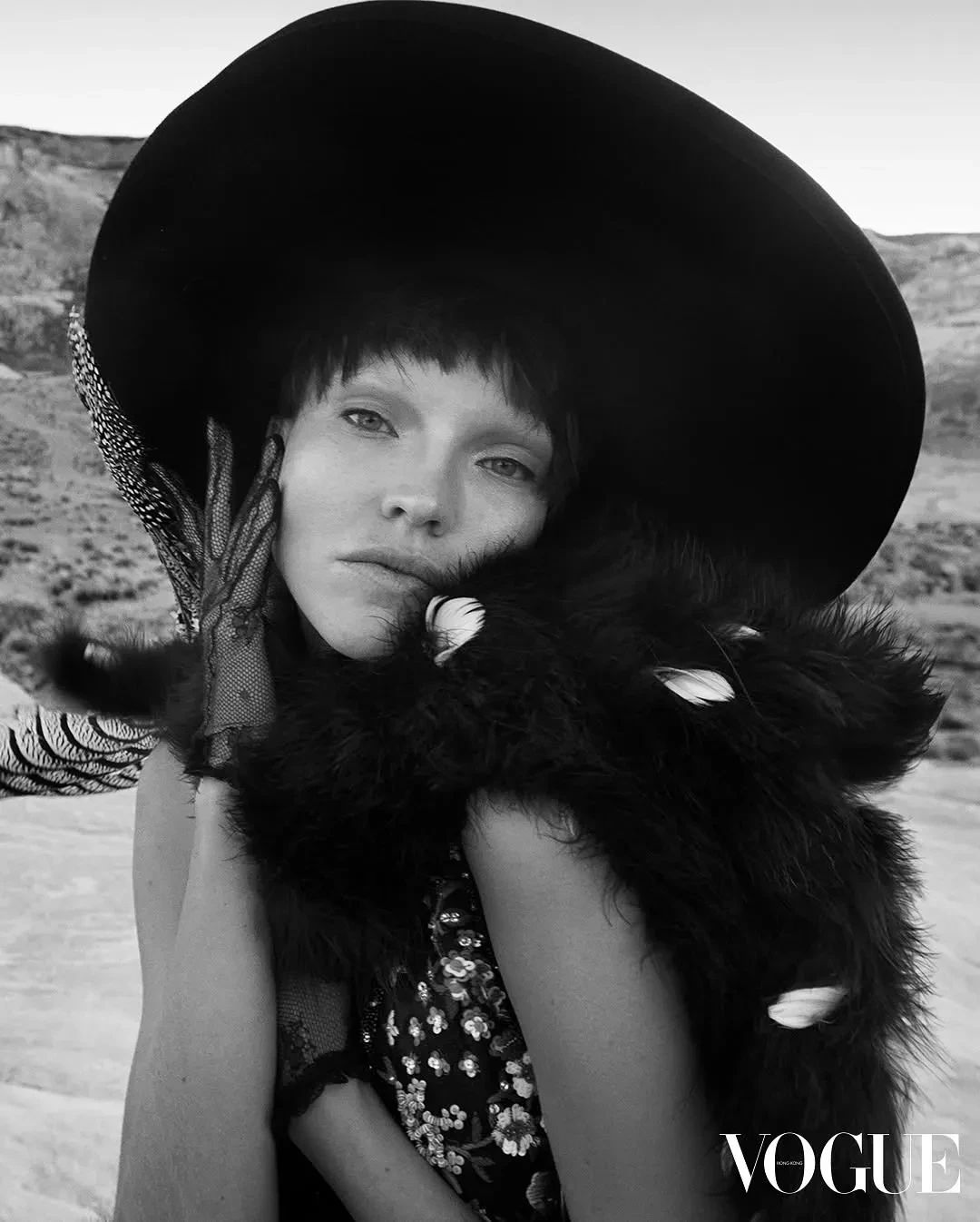 На снимках звезда фильма "Анна" позирует с короткими тёмными волосами на фоне пейзажей американского штата Юта. На обложке она одета в платье Giorgio Armani, а для съёмки Саша примерила прозрачное платье Saint Laurent, шляпу Valentino с пером и меховым шарфом и образ total black Chanel.