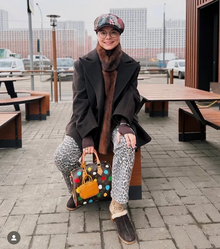 Молодая супруга Петросяна выгуляла укороченное пальто ультрамодного коричневого оттенка. Его она сочетала с леопардовыми джинсами и объемным норковым шарфом. А вот дальше что-то пошло не так. Сумка в горох от Louis Vuitton, меховые мюли в сочетании с носками Gucci и пестрый берет-гаврош. Слишком всего много, и все из разных опер. Я бы сняла нелепый «гаврош», заменила бы сумку, а вместе мюлей надела бы коричневые лоферы.