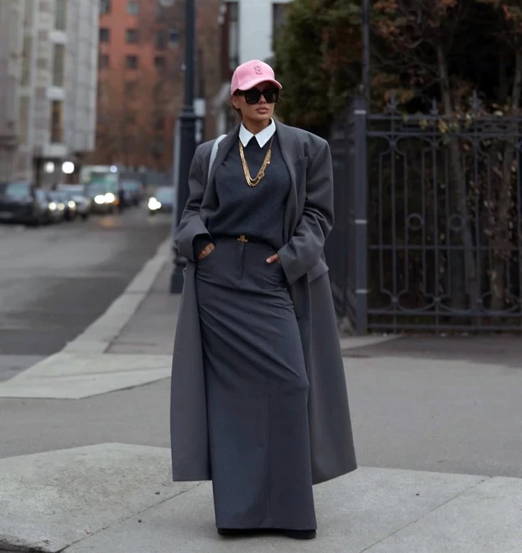 В образе Виктории все «макси». Пальто макси, юбка макси. Плюс джемпер в сочетании с белой рубашкой, застегнутой на все пуговицы. А сверху еще розовая бейсболка. Ощущение какой-то закупоренности. Хотя для Бони, которая, наоборот, любит раздеваться, это даже как-то нетипично. Я понимаю, что она хотела прорекламировать кепки своего бренда, но уж очень хочется снять неуместный головной убор, распустить волосы и добавить образу легкости.