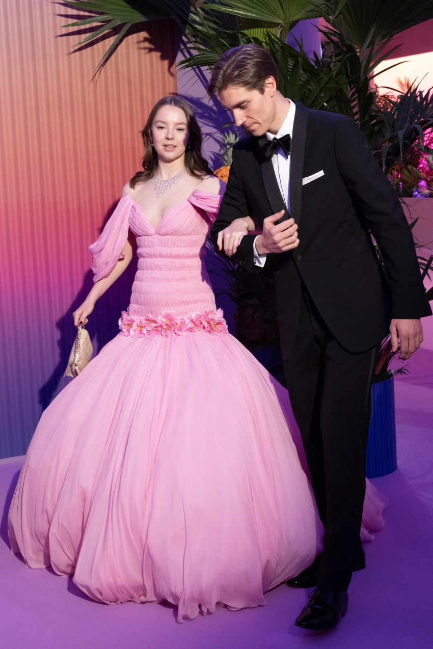 В одном из пространств комплекса Monte-Carlo Sporting, украшенном в тематике “тропики” пальмами и экзотическими цветами, собрались княгиня Шарлен (в Dolce&Gabbana) и князь Альбер II, принцесса Каролина и Шарлотта Казираги (обе в Chanel), Александра Ганноверская (в Giambattista Valli), певица Ширли Бэсси и другие.