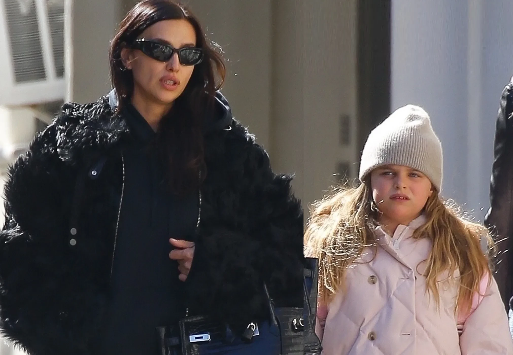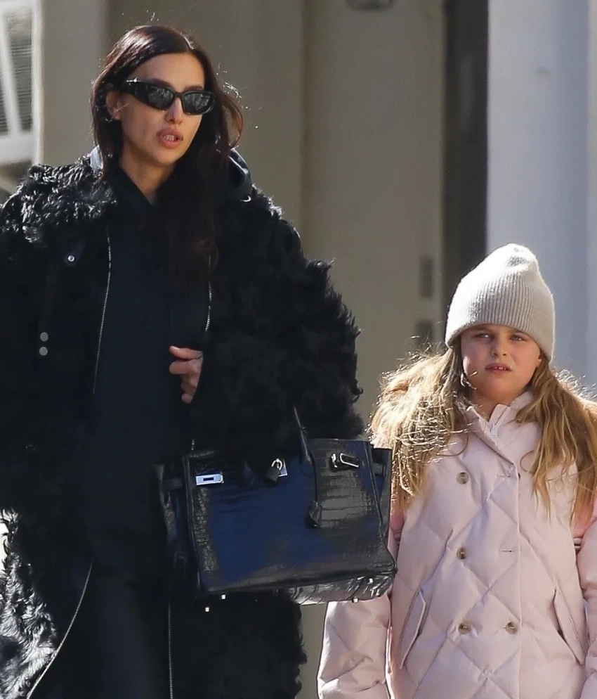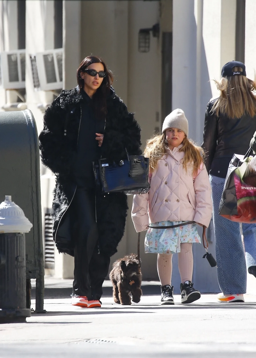 Ирину Шейк заметили на прогулке с дочерью в Нью-Йорке. Компанию им составил щенок восьмилетней Леи. 39-летняя топ-модель была в чёрной шубе и ярких кроссовках Nike, в руках она держала чёрную сумку Hermes. На Лее было нежно-голубое платье, поверх которого она надела короткий розовый пуховик.