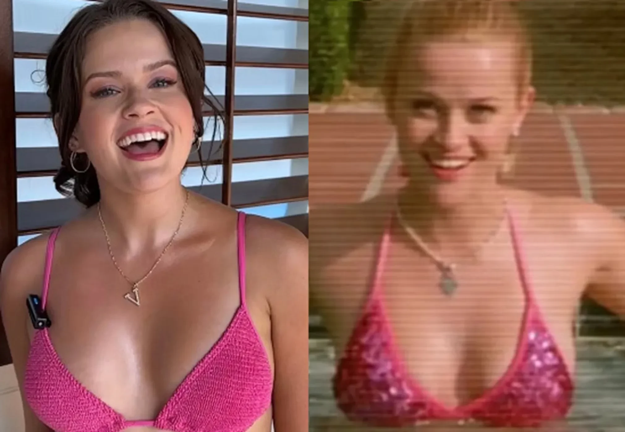 Судя по кадрам из соцсетей, Ава появилась перед камерой в ярко-розовом бикини — в таком же её мама снялась в эпизоде, когда её героиня Элли Вудс записывает видеопрезентацию для поступления в Гарвард, сидя в бассейне. Образы матери и дочери совпали даже в выборе украшений: на Аве была цепочка с буквой V (её героиню зовут Вероника), а на Риз — подвеска Tiffany в форме сердца.