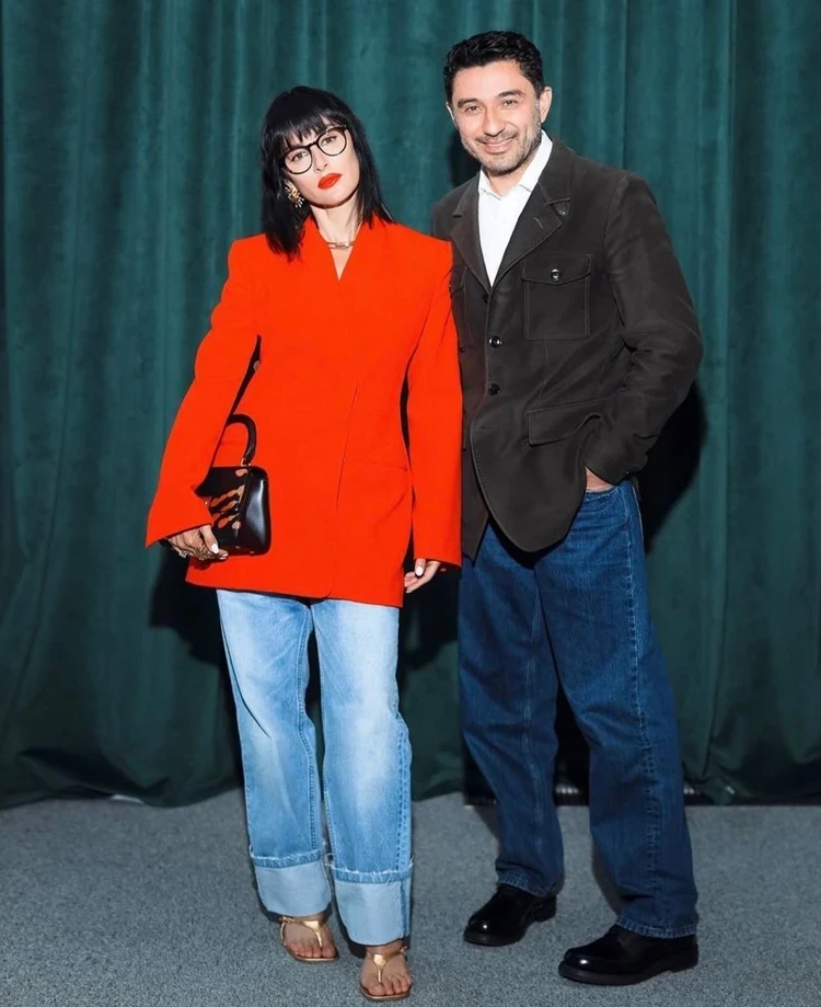 Тина сделала ставку на яркий жакет своего любимого алого цвета. Его она скомбинировала с широкими джинсами и золотистыми босоножками, похожими на вьетнамки. Плюс сумка с золотистым принтом и эффектные крупные украшения. А также помада в тон пиджака. Единственное, слишком открытые босоножки я бы заменила на золотые лодочки или хотя бы на мюли.