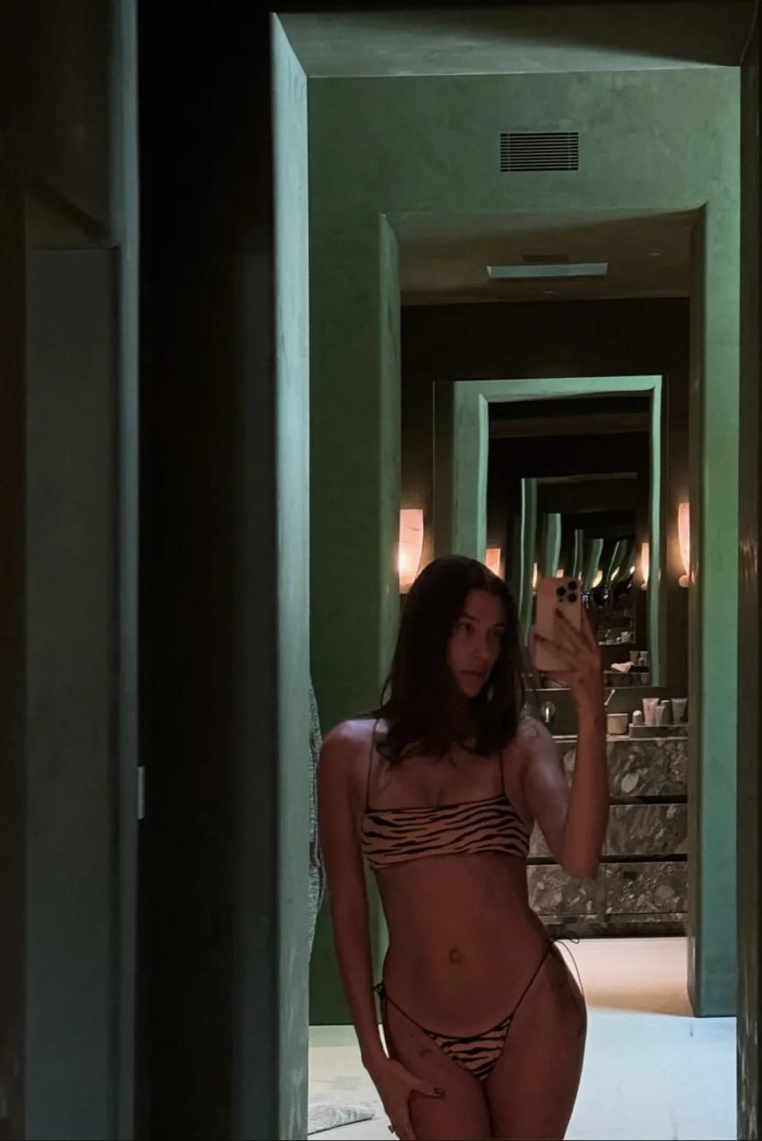 На новом снимке 28-летняя модель показала фигуру спустя восемь месяцев после родов. Хейли позирует в купальнике в чёрно-белую полоску напротив зеркала.