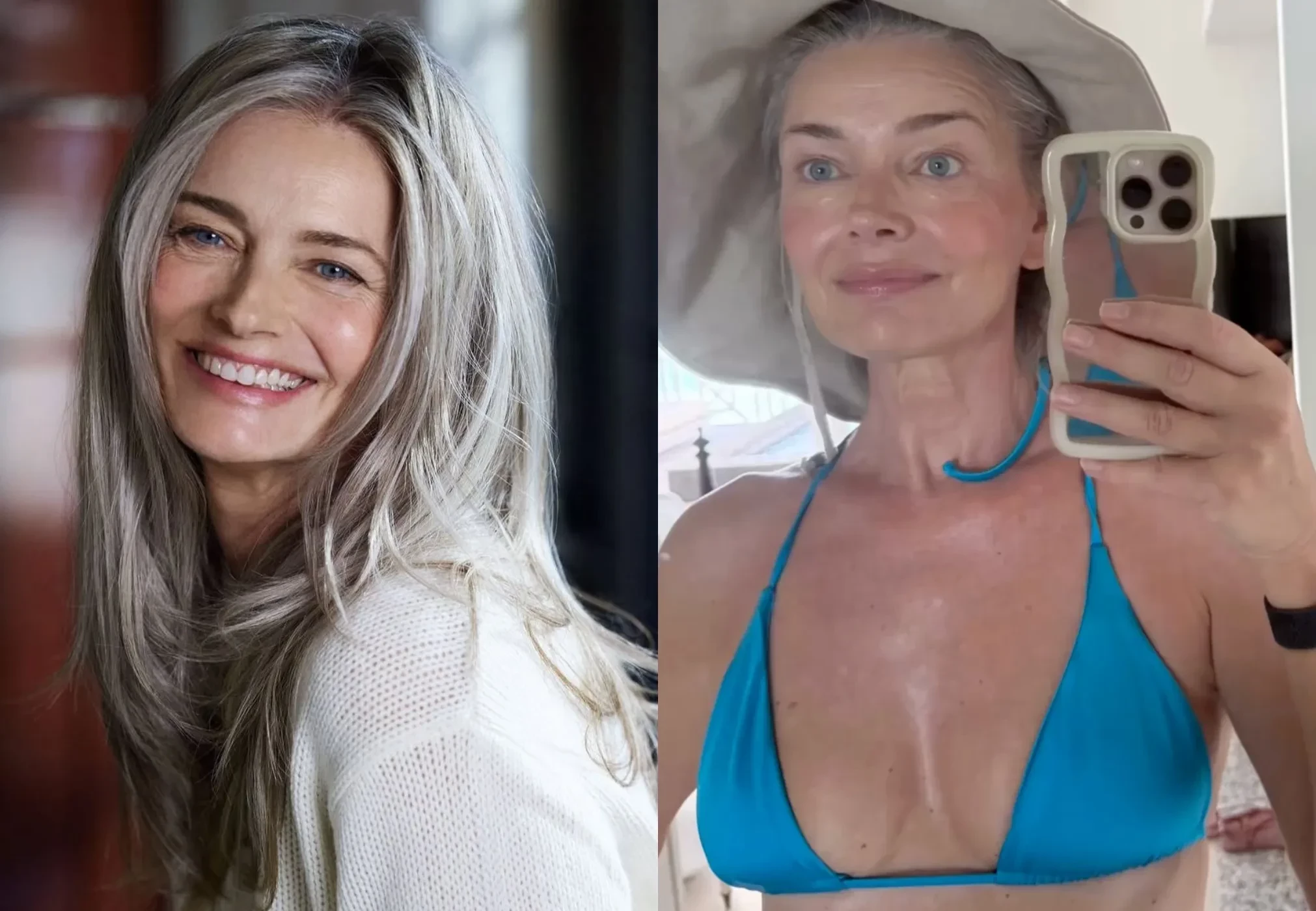 Супермодель Паулина Поризкова опубликовала селфи в бикини в честь своего 60-летия. На снимке звезда подиумов 1990-х с улыбкой позирует в зеркале в голубом купальнике и шляпе.