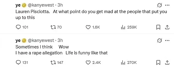 Также он высказался о сексуализированном насилии, в котором его обвиняют. Ранее на Канье подала в суд его бывшая ассистентка Лорен Пишотта: она утверждала, что рэпер преследовал её и домогался, когда она работала на него с 2021 по 2022 год. Уэст в новой серии постов отреагировал на эти обвинения: "Не удивляйтесь, когда девушка флиртует с вами и забывает заявить об изнасиловании до третьего раза. Иногда я думаю: "Ого, меня обвиняют в изнасиловании, какая забавная жизнь".