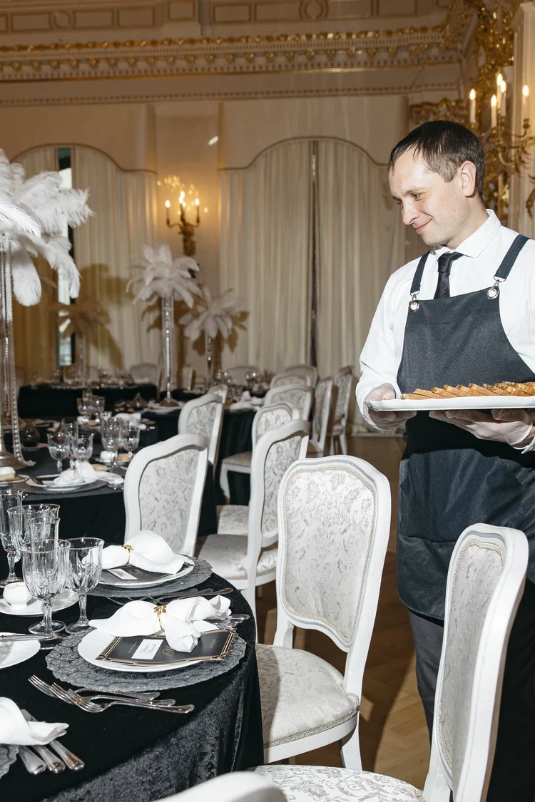 - Свадьба вдохновлена стилем ревущих 1920-х. Динамичность развития этой эпохи отражается в каждой детали свадьбы: в музыке, еде и декоре. На один день особняк Мясникова вернулся в прошлое, в котором тесно переплетаются стиль ар-деко и джаз. Концепцию оформления торжества претворили в жизнь декораторы из Петербурга. Обилие жемчужин, кристаллов, тонкой материи - отражение урбанистического направления эпохи, которое сочеталось с антикварным серебром, канделябрами и золотом парадных залов. Романтическую атмосферу праздника создали живые цветы, - поделилась с «КП-Петербург» организатор свадьбы Екатерина Сафронова.