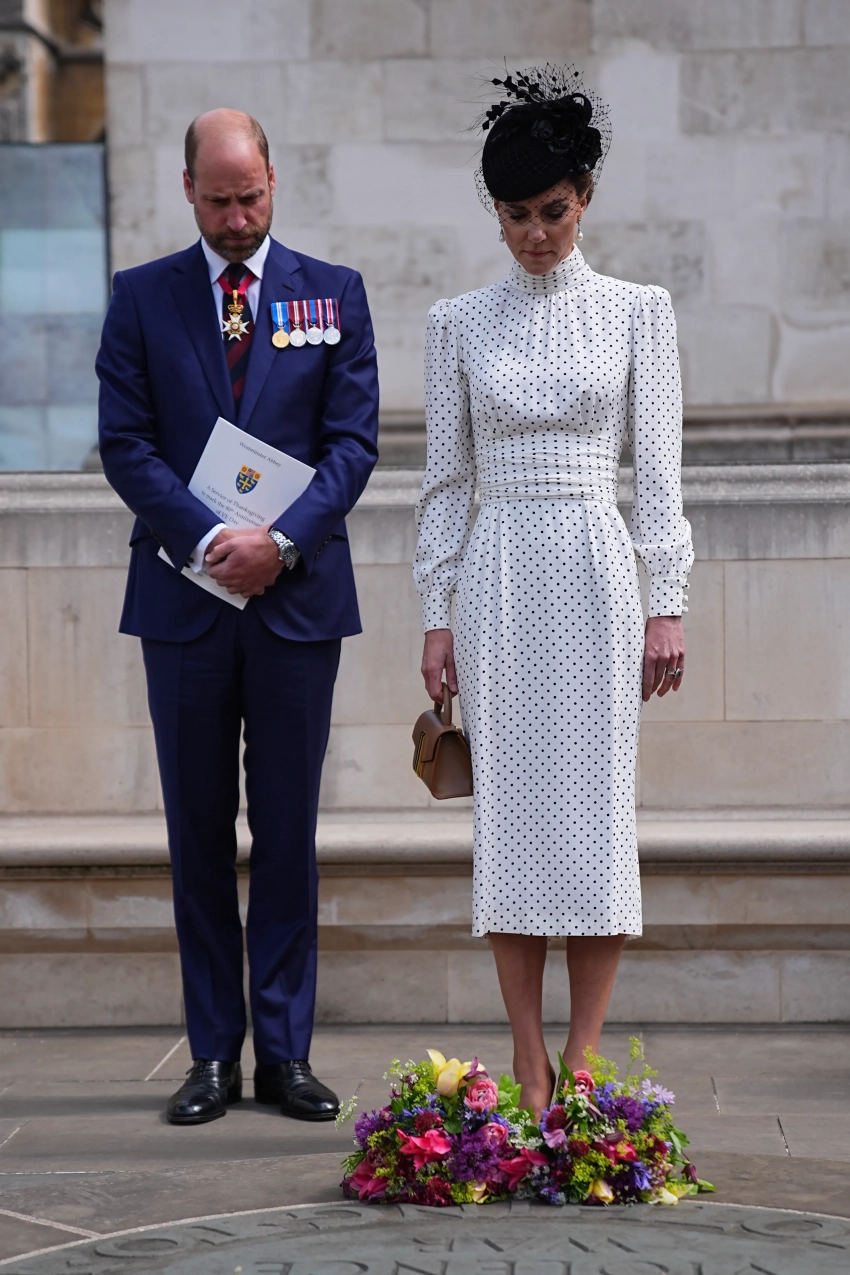 43-летняя принцесса Уэльская выбрала для выхода шёлковое платье в черный горох от Alessandra Rich. Образ она дополнила бежевыми лодочками от Ralph Lauren и сумкой в тон от DeMellier. Завершением ансамбля стала чёрная шляпка с вуалью от Juliette Botterill, а в качестве украшений Кейт отдала предпочтение жемчужным серьгам-каплям Collingwood, ранее принадлежавшим принцессе Диане. Принц Уильям появился на службе в классическом синем костюме.
