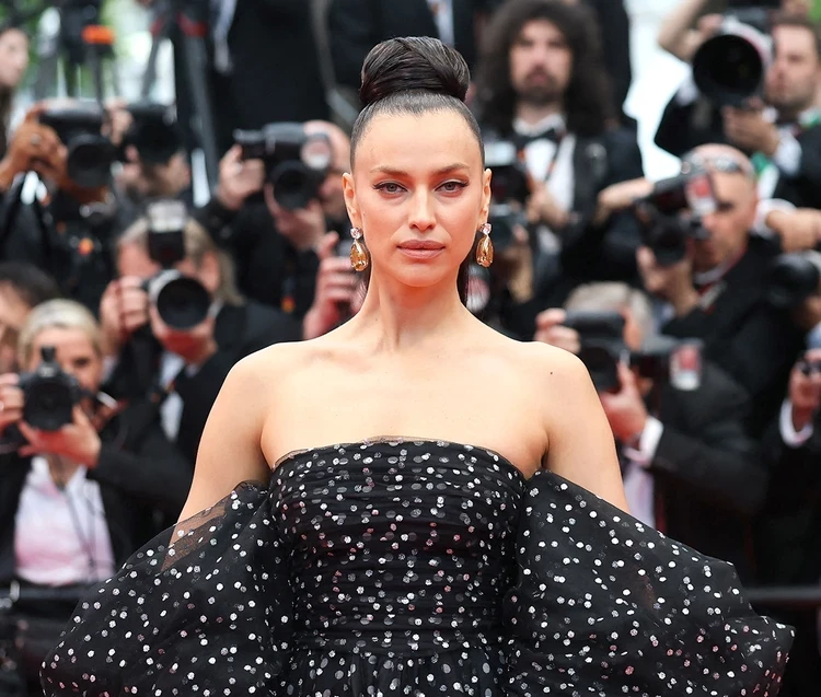 Одна из первых на ковровой дорожке появилась 39-летняя Ирина Шейк. Модель продемонстрировала шикарное платье в горох с объемными рукавами от Armani Prive. Волосы Ирины частично были забраны в высокий пучок, и одна прядь специально выпущена. Образ Шейк дополнила перчатками и серьгами с камнями.