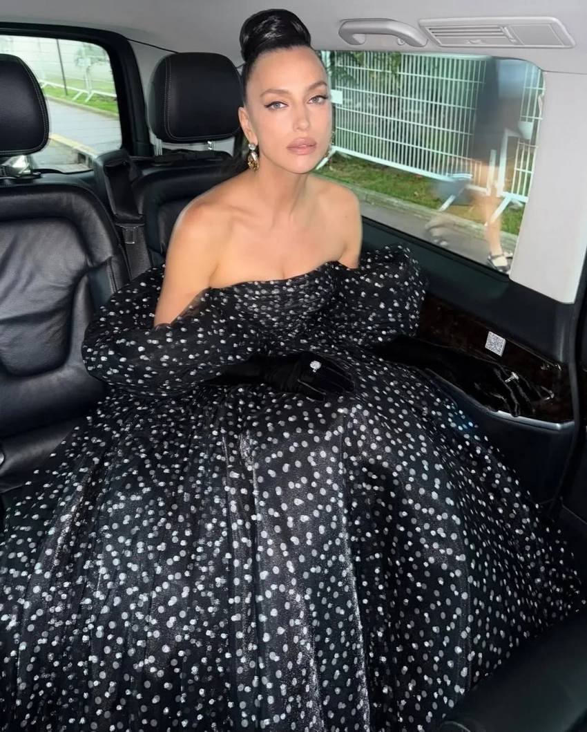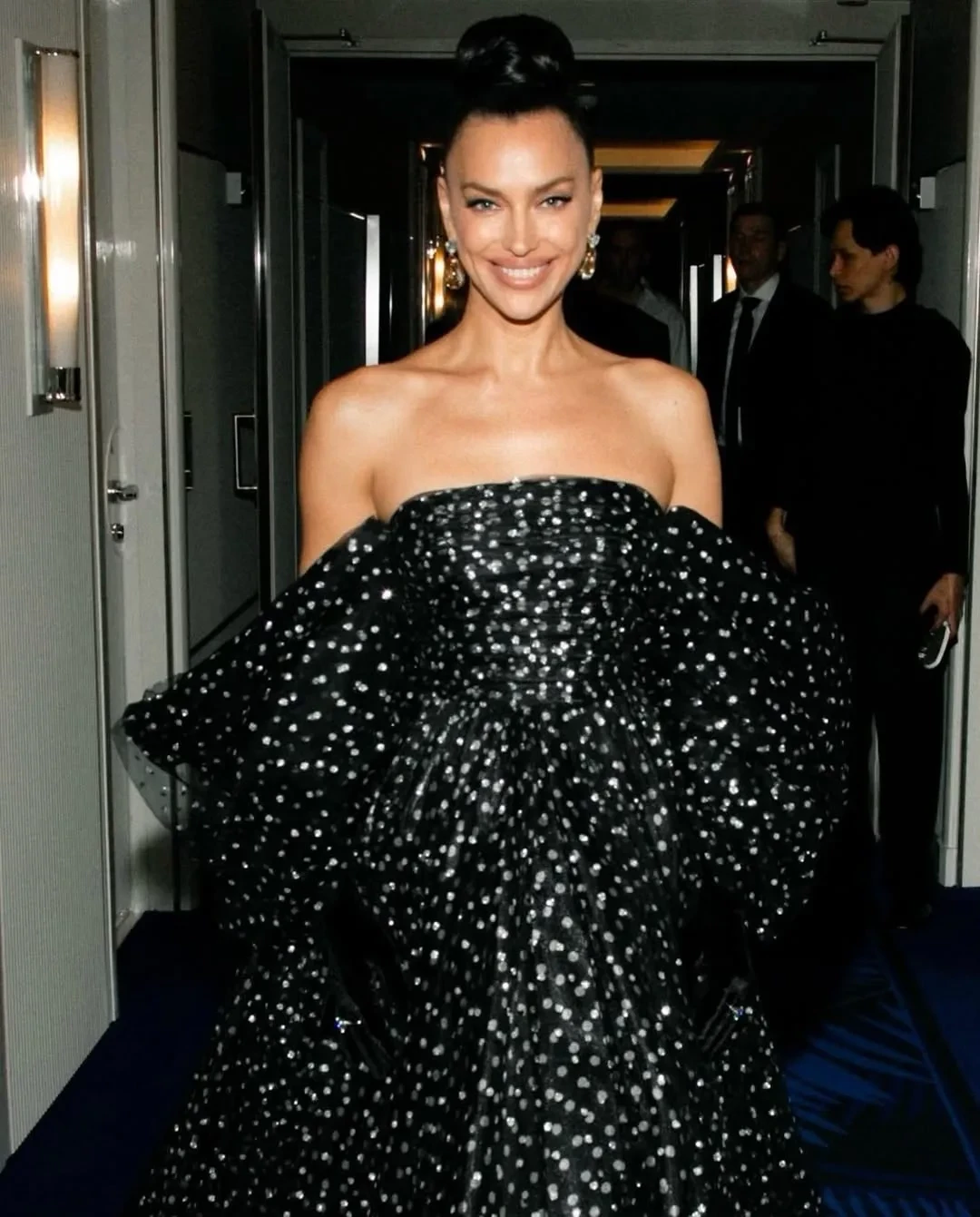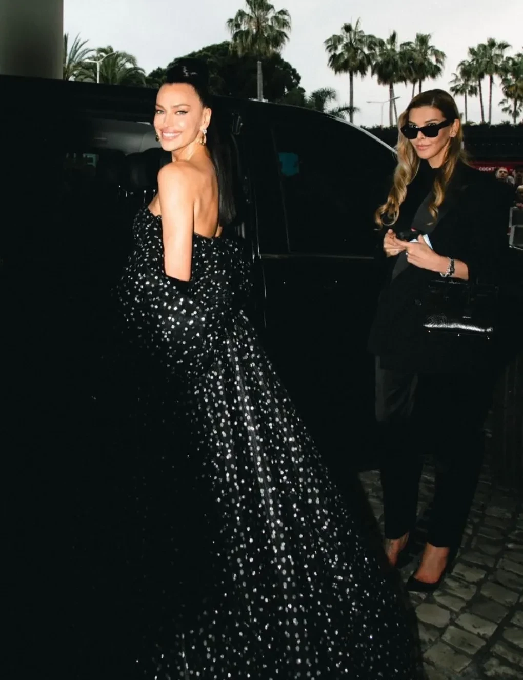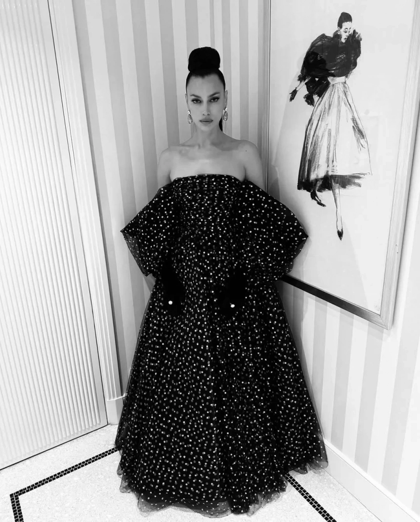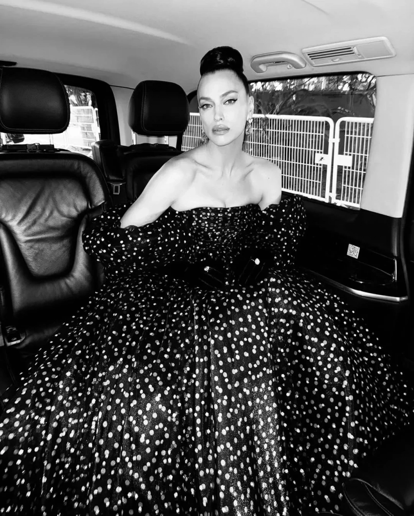 39-летняя российская супермодель вышла на красную дорожку в пышном платье в горох Armani Privé. Её образ дополнили украшения Anita Diamonds: серьги с бриллиантами грушевидной формы весом 60 каратов каждая и два кольца с 15-каратными бриллиантами, а также чёрные перчатки и высокая причёска. "Какая волшебная ночь в Каннах. Спасибо", — написала Ирина в соцсетях.