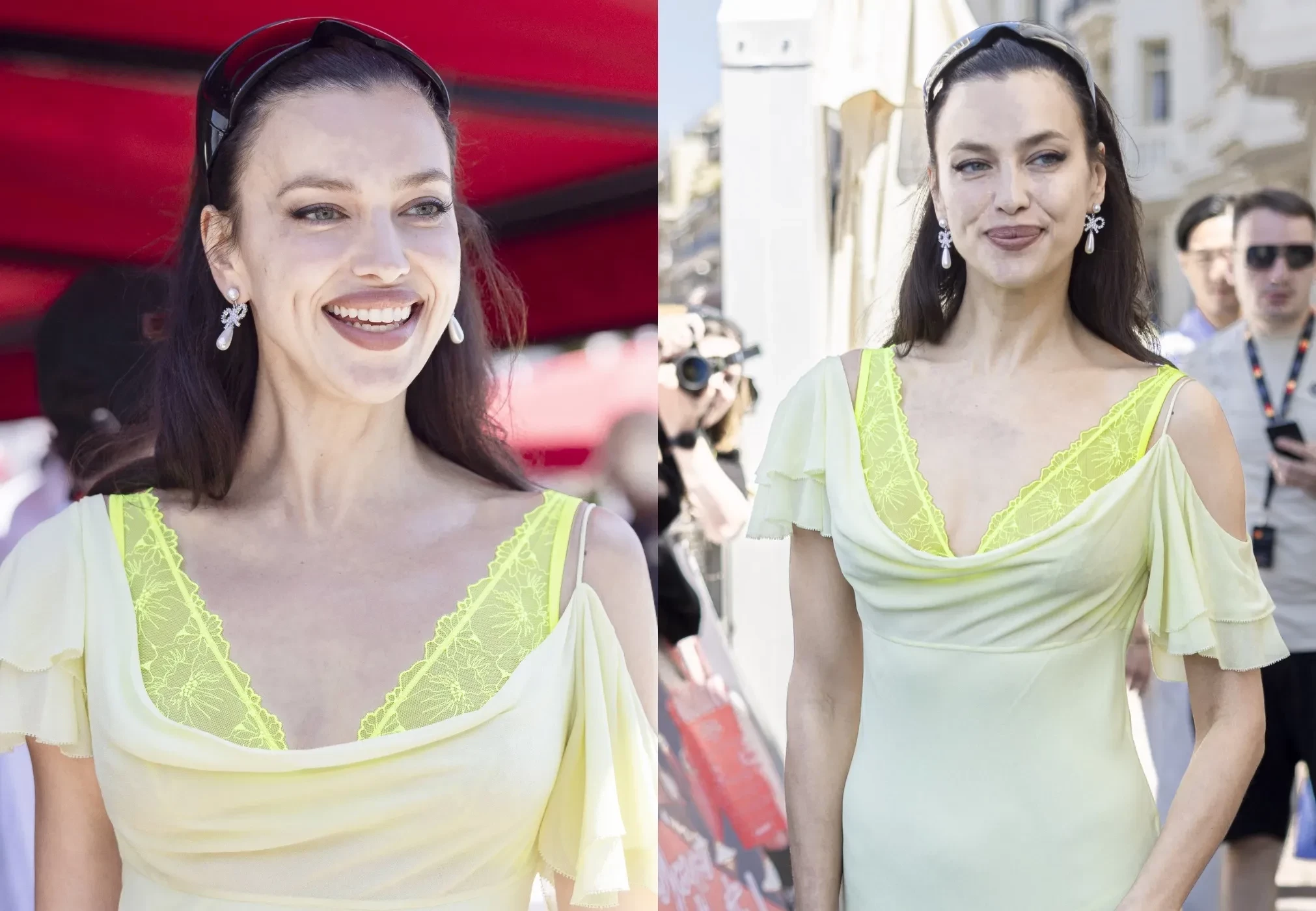 Накануне Шейк появилась перед папарацци в лимонном платье, из которого был виден кружевной бюстгальтер салатового оттенка (дресс-код, запрещающий "голые" платья, действует только на красных дорожках — и Шейк его соблюдает), кроссовках и носках Nike. Образ Ирина дополнила массивными солнцезащитными очками-маской, серьгами с бриллиантами и белой сумкой.