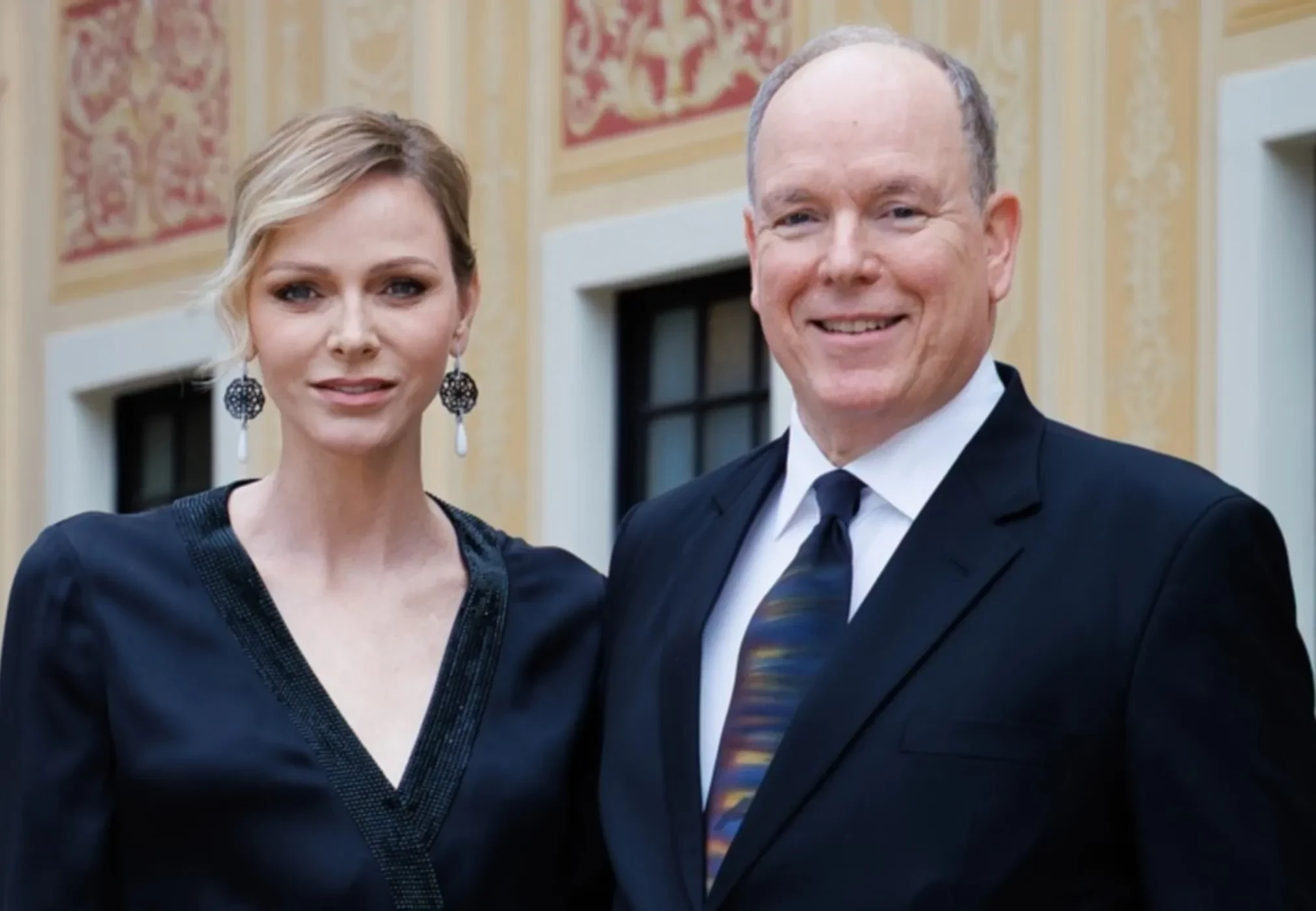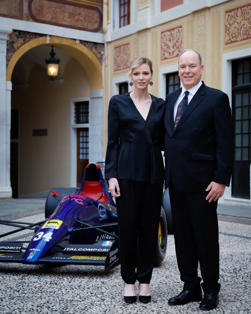 Князь Монако Альбер и княгиня Шарлен посетили торжественный приём по случаю 82-го Гран-при "Формулы-1" в Монако. Супружеская чета позировала на курдонёре (парадном дворе) на фоне гоночного болида. Для официального выхода княгиня Шарлен выбрала чёрный ансамбль, состоящий из блузки свободного кроя и брюк, а князь Альбер, поддержав стиль супруги, надел классический чёрный костюм.