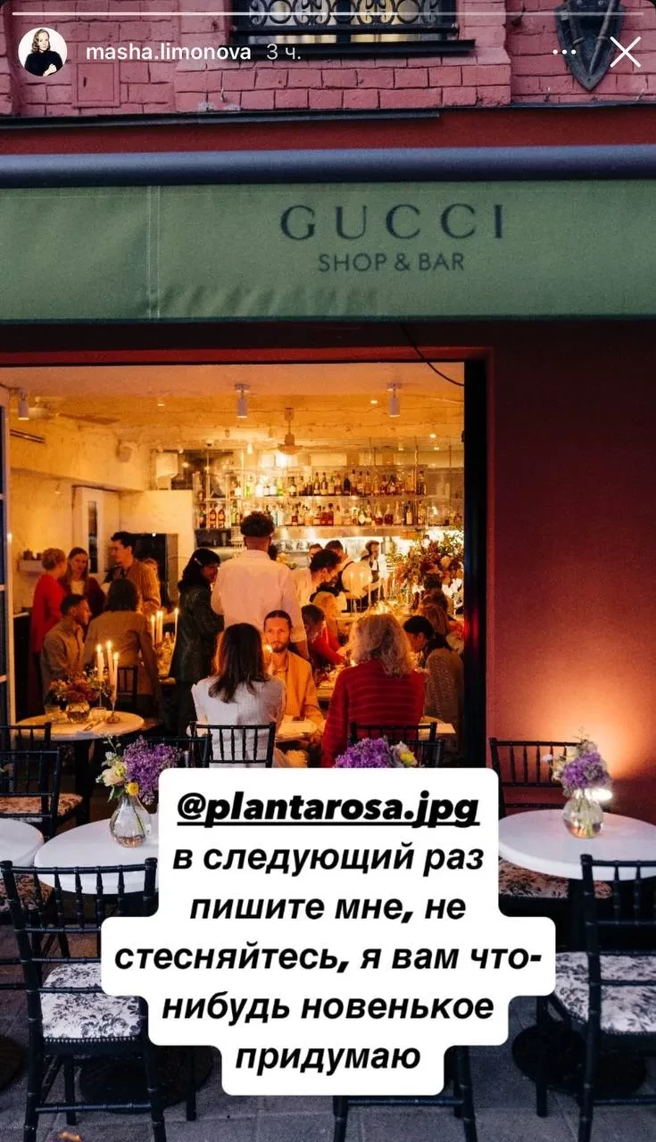 Gucci Shop & BarАлёна Долецкая, Мария Лимонова и Варвара Шмыкова на открытии Gucci Shop & BarВ свою очередь, телеграм-канал "Безфильтров" напомнил о контексте: "Gucci — международный гигант, Planta Rosa — молодой российский бренд", а потому сравнение кейсов некорректно из-за разницы в масштабах и бюджетах. К тому же самому ресторану как "лучшему по расположению споту района" выгодно устраивать коллаборации, и отказываться от них "в память о Gucci" попросту неразумно.