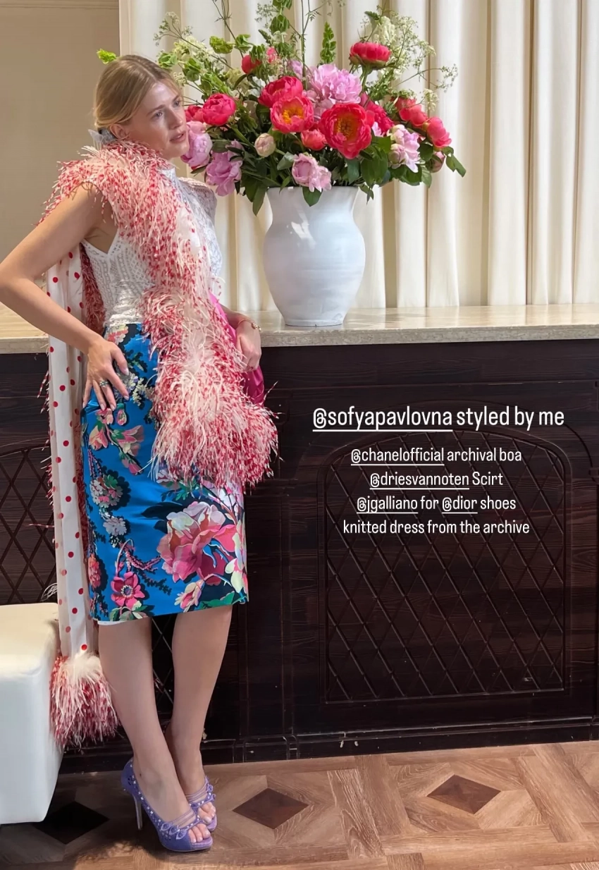 37-летняя актриса и супруга генерального директора Первого канала Константина Эрнста, известная своей любовью к отечественным брендам, появилась на мероприятии в одежде зарубежных дизайнеров. Софья надела полупрозрачный ажурный топ, юбку Dries van Noten с цветочным принтом и фиолетовые туфли Dior времён Джона Гальяно, а акцентом в её образе стало архивное боа Chanel с перьями. Компанию Софье на мероприятии составила её стилист Анастасия Соломеина, а среди гостей также были Андрей Бартенев и Данила Поляков.