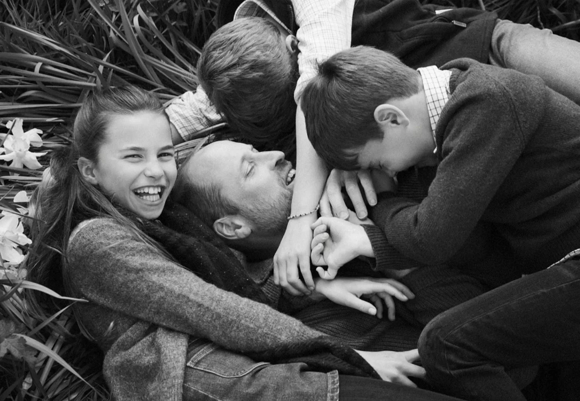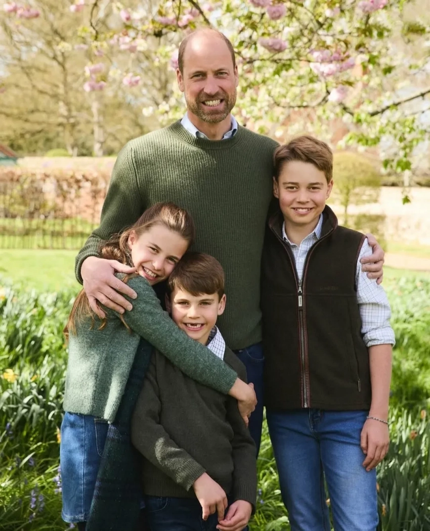 На первом фото Уильям обнимает 11-летнего принца Джорджа, 10-летнюю принцессу Шарлотту и 7-летнего принца Луи, глядя в камеру. На втором отец и его трое детей дурачатся в траве. Автором снимков выступил фотограф Джош Шиннер.