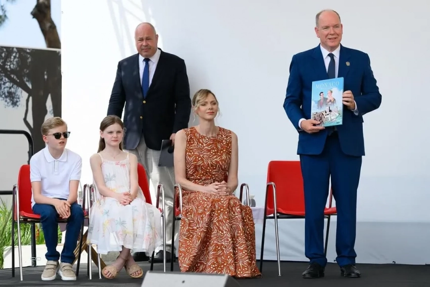 47-летняя княгиня появилась на публике в длинном коричневом платье с узором, а 67-летний князь надел синий костюм с галстуком. 10-летний сын супругов, наследный принц Жак, позировал фотографам в белом поло, джинсах и солнцезащитных очках, а его сестра-близнец, принцесса Габриэлла, в белом сарафане.