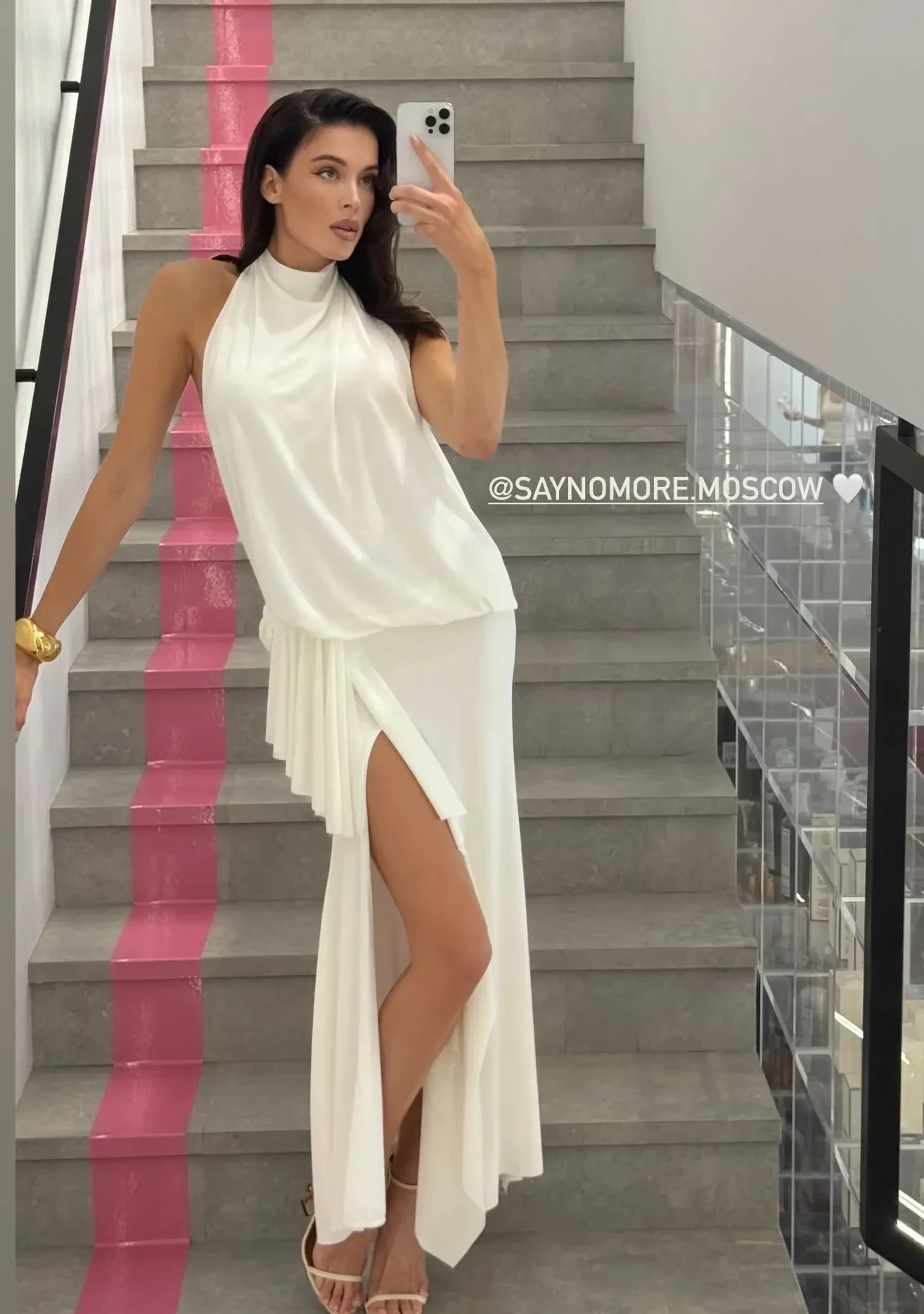 31-летняя экс-возлюбленная сына миллиардера Бориса Зингаревича встречала гостей в белом платье Say No More с открытой спиной и босоножках Saint Laurent. После инцидента на таможне, который перерос в уголовное дело, модель стала носить меньше дорогих украшений и дополнила свой образ не многомиллионными изделиями от Cartier, а одним золотым браслетом. (Хотя для фото она примерила и другие украшения).